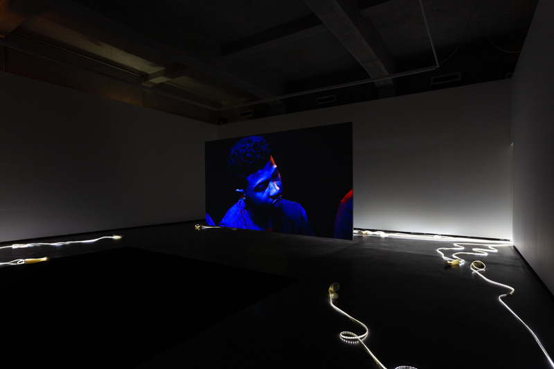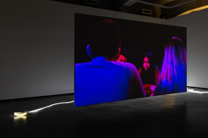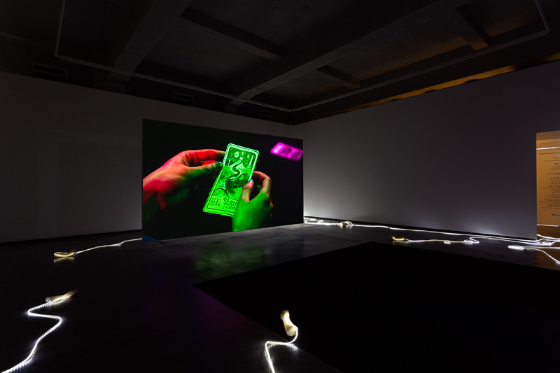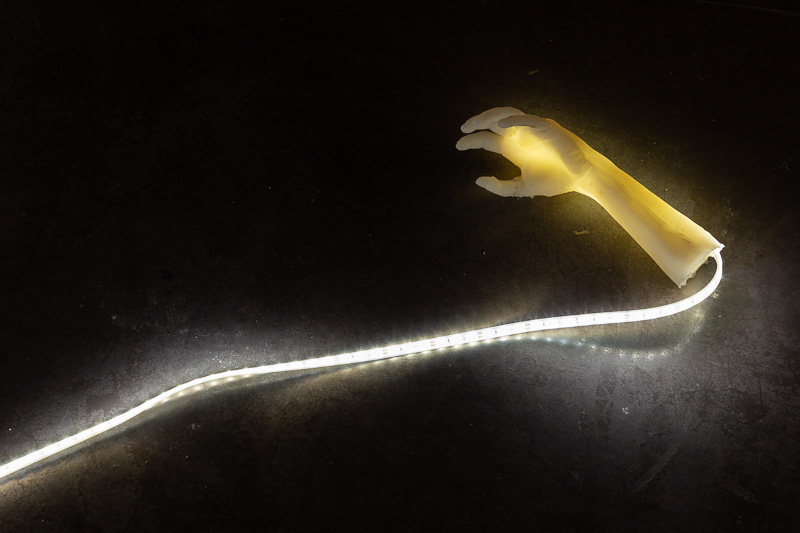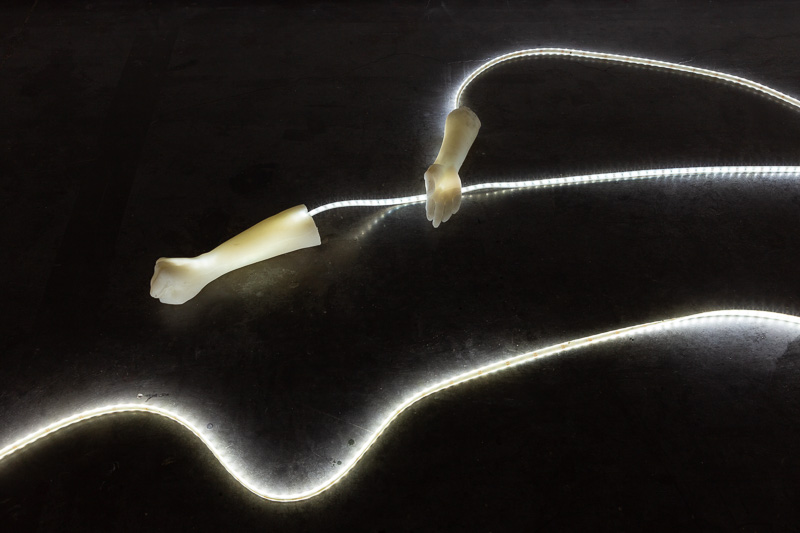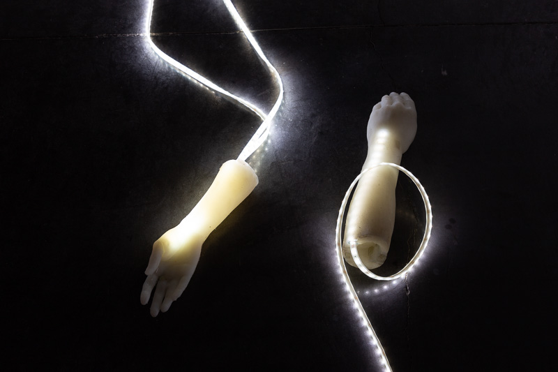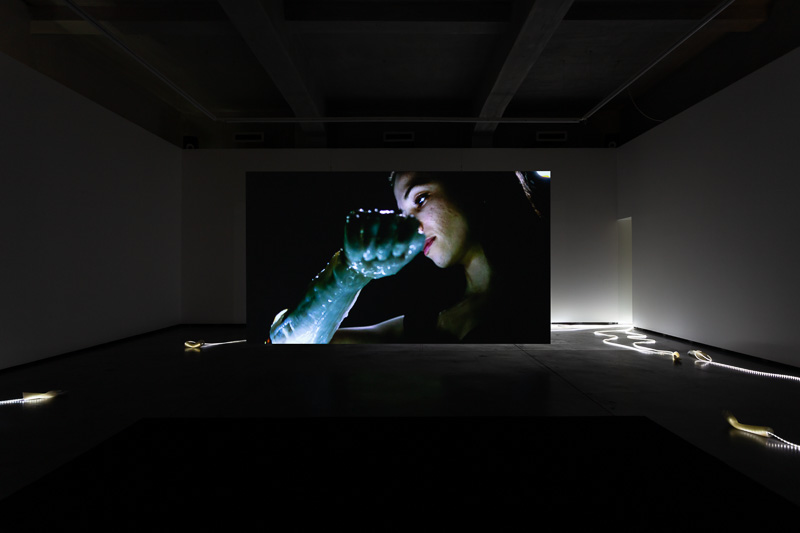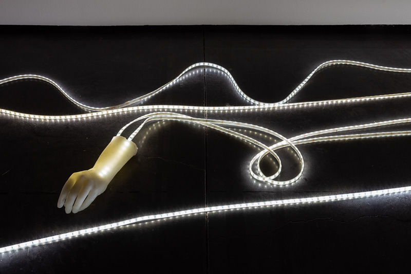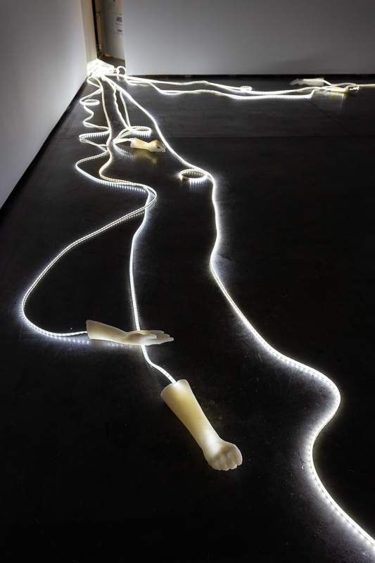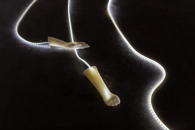 The silicone props snaking through the space were fabricated with everyday electronic components and echo the props used in the workshop and film, alluding to a future populated by technological prosthetics as extensions of the human body and its capacities.”
