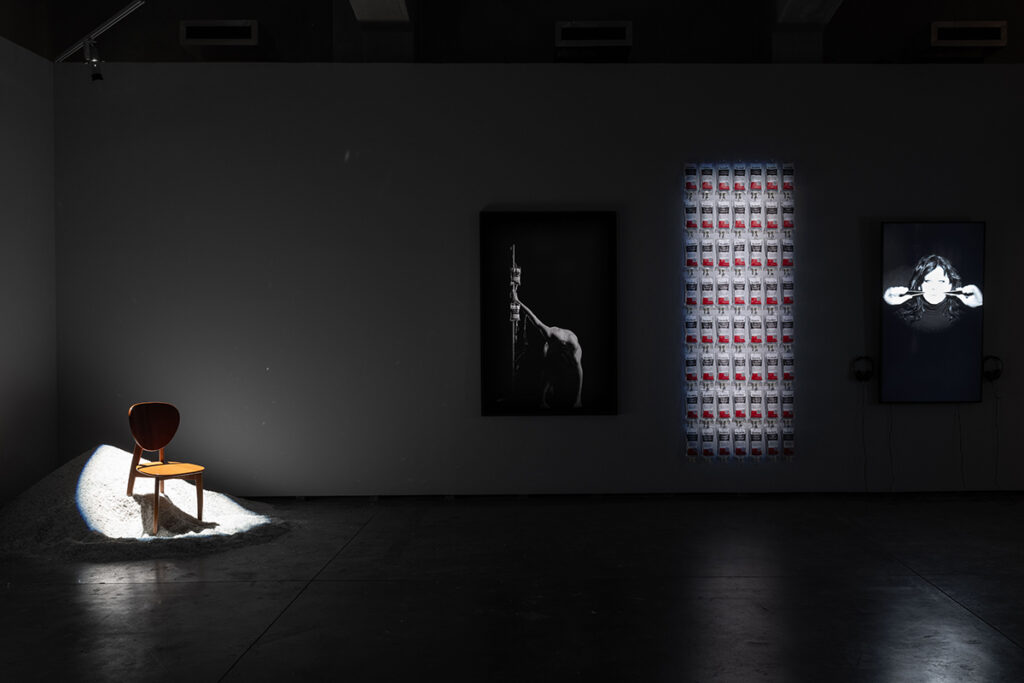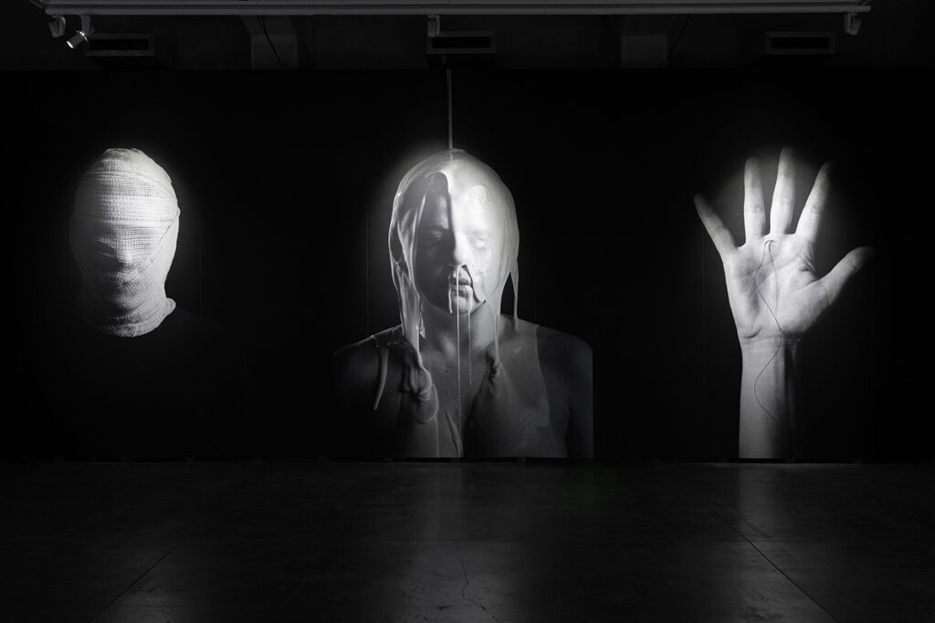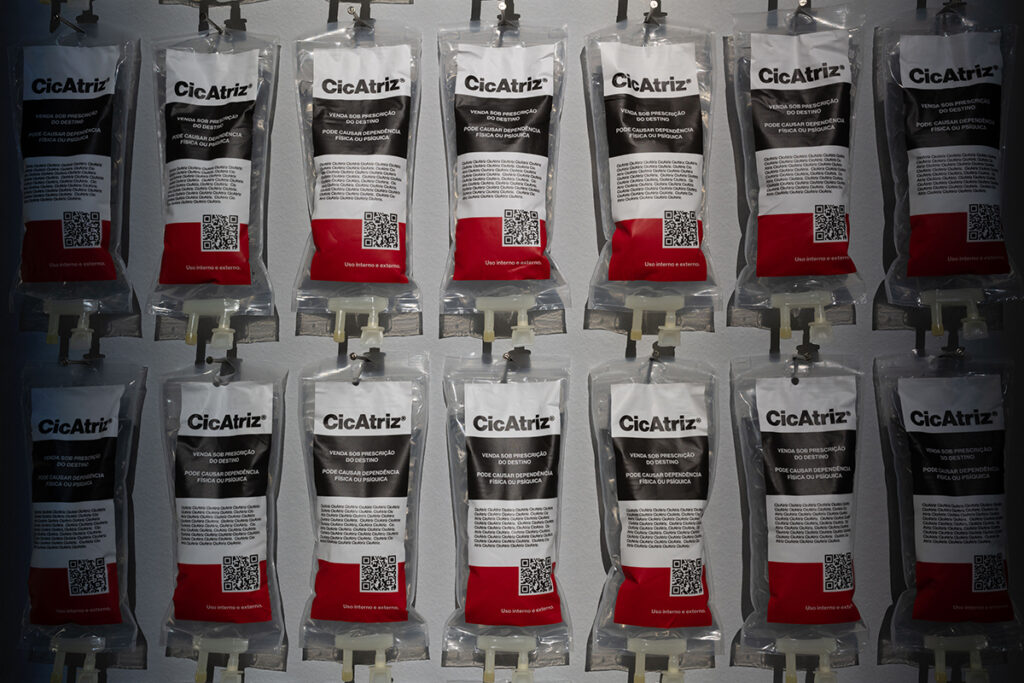 Shards of the traumatic accident appear, for example, in the video Festa de Natal [Christmas Party] (2023) and in the photograph A montanha com o peso nas costas [The mountain with the weight on its shoulders] (2023). While the matter that injured her – glass – shows up in these works, the elements that participated in her healing, such as gauze, surgical suture, saline and bandages, are revealed in a series of other works, like in the triptych of photographs Untitled (2023), and also in Soro de atriz [Actress saline] (2023) and A mulher com soro [Woman with a drip] (2023).