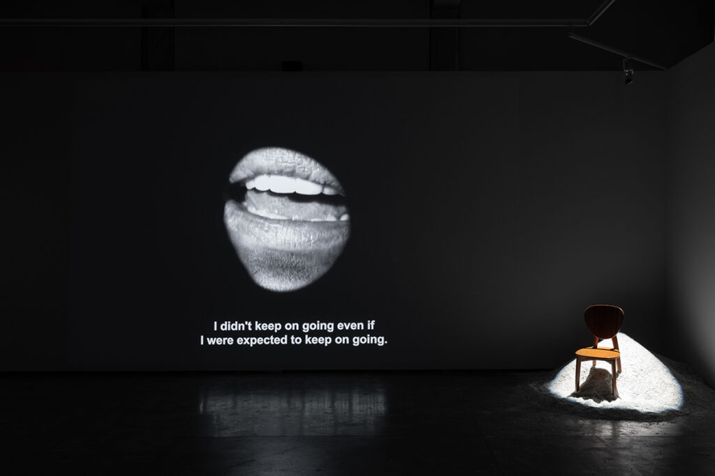 In the video Auto-acusação [Self-accusation] (2023), which gives the exhibition its title, Paz references the 1960s by paying tribute to Austrian playwright Peter Handke. In the play of the same name, written in 1965, the latter sought to make spectators aware of the artificiality of theatre, in order to break with the illusionary paradigms of classical dramaturgy. While Handke’s text was conceived to dispense with sets and reduce scenic elements as much as possible, the artist’s video also operates according to an economy of means. We see only the outline of her lips, which become almost abstract elements and remind us of an open wound. The detached mouth of the actress-artist recites the text of the play in darkness. Note that the play was written in first person, in order to blur the boundaries between character and actor. This dissolution of limits takes on other meanings in Paz’s poetics, which also operate on the limit between biographical details and fiction.