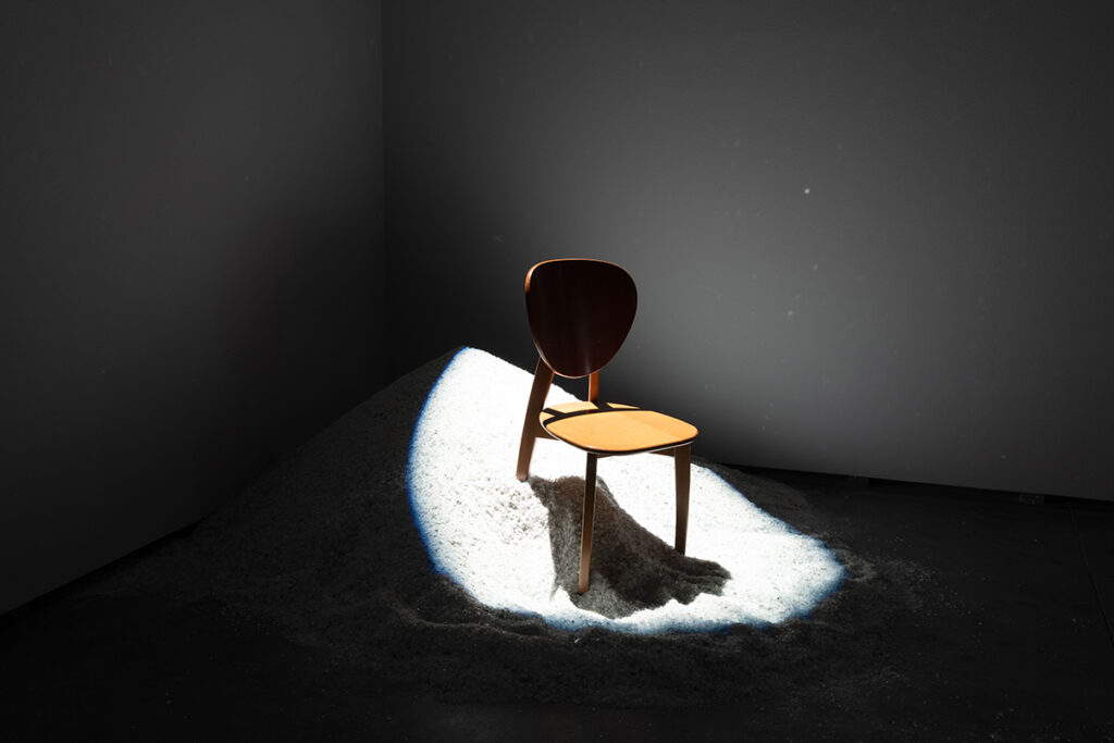 A central object in the exhibition, the artist’s body sometimes appears as a finite and fragile material, subjected to acts of imminent violence, like when shards of a mirror press into her face in the video Silêncio [Silence] (2023). Carried out by the artist herself, these acts verge on violating the surface of her skin, as if they seek to re-enact the tragic moment of the accident. At the same time, the mirror plays a singular role in her research, appearing as a simultaneously cutting and totalising element. It is through using a mirror that we are able to view ourselves fully; without this resource we would only see fragments of our body.