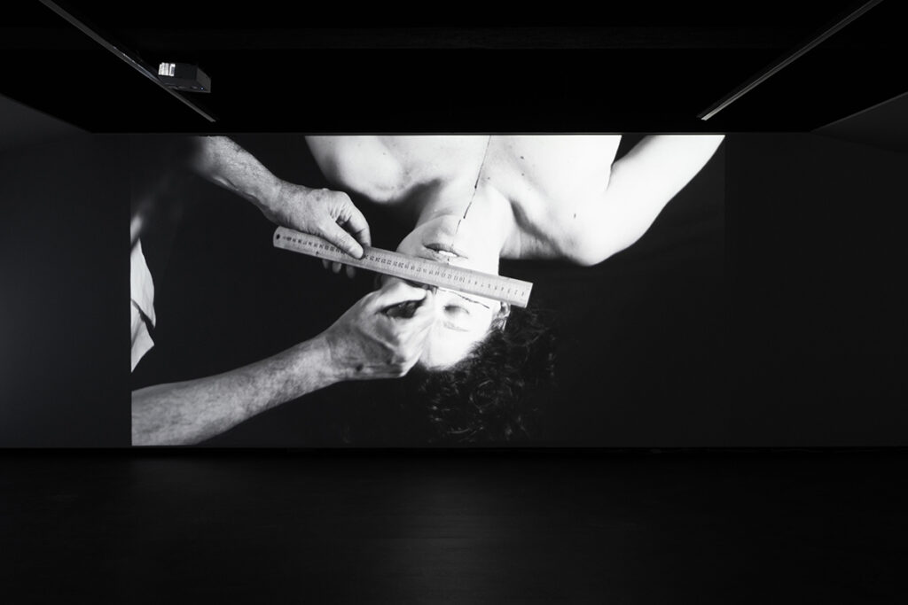 Skin is not only the misleading appearance of things, but rather, as Paul Valéry famously asserts,[1] ‘the deepest thing’ in the human being. This membrane that separates interior and exterior contains marks that reveal intersections between past and present. The epidermal surface of the artist is marked and subjected to measurements in the video De-marcação [De-marcation] (2023), fragmented in axes of symmetry and crossings-out, which evoke a scientific anthropometry. Her works operate on and from her own body, seen not merely as a biological organism but as a matter steeped in history.