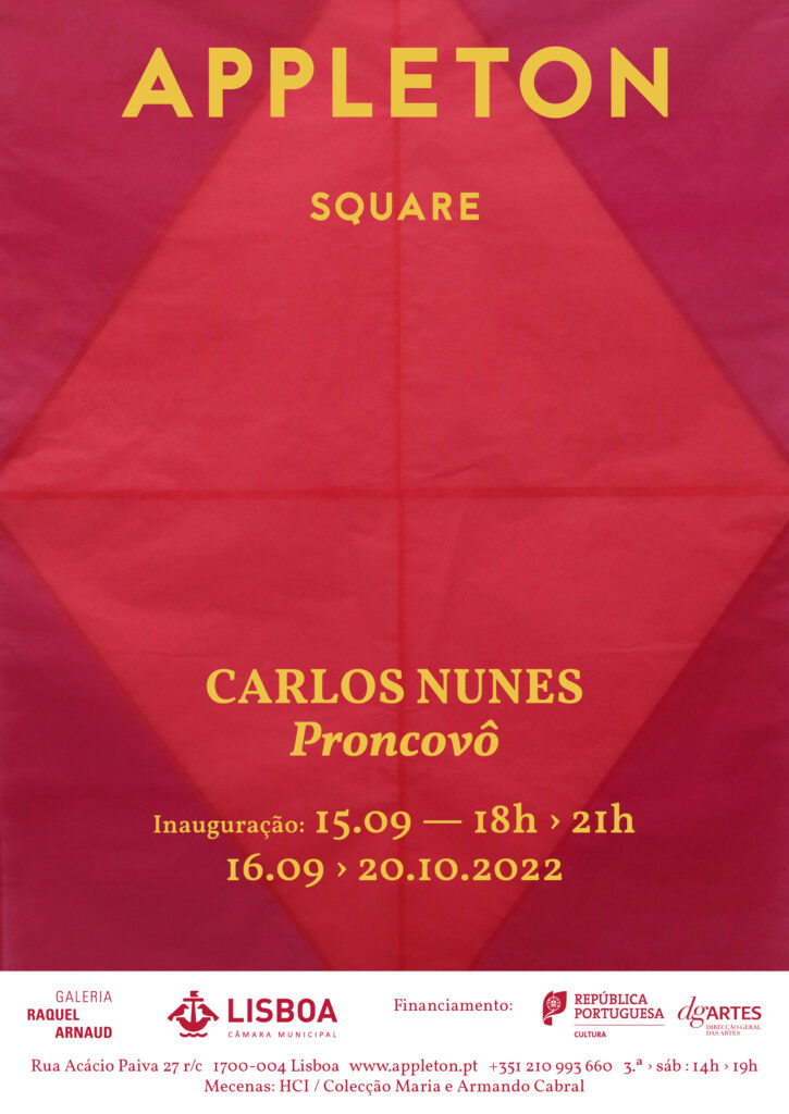 A ira ria culminated in the exhibition of a long-term project that began some years ago thanks to a growing interest in palindromes, which in 2021 led Nunes to build a tower several metres high on which he placed the slogan a torre da derrota (the tower of defeat), with which he travelled, in the company of his son, to Brasilia, and which was displayed in all its dignity in Galeria Raquel Arnaud. Meanwhile, in Appleton, proncovô – an expression from the Minas Gerais region meaning pra onde que eu vou, or where am I going, linked to oncotô (where am I) and quencosô (who am I), the three basic existential questions – re-approaches some earlier visual experiments, started in 2019, using coloured silk paper and lines of string with a structuring function, that reinforce a feeling of levity by reacting to each observer who passes by.