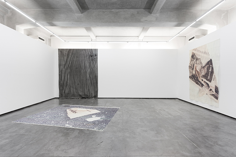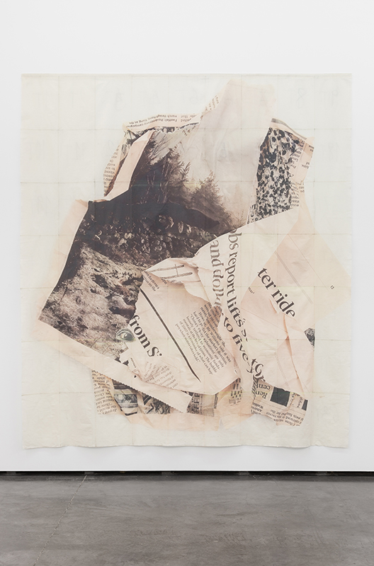 fabric, and the canvases hanging in passageways combine in an unexpected cohabitation of elements that are traditionally foreign to each other. The artist is known to use fragmented newspaper images printed on fabric, often depicting animals – another familiar yet strange body. The newspaper’s ephemerality is translated and transformed as it is transferred to the fabric – scenario – curtain – tent. These supports are also temporary, but not as much as a daily newspaper. The present is extended with these visual poems, using cut-up, a technique in which text is randomly cut up, systematized in 1959 by the writer William Burroughs and the painter Brion Gysin.