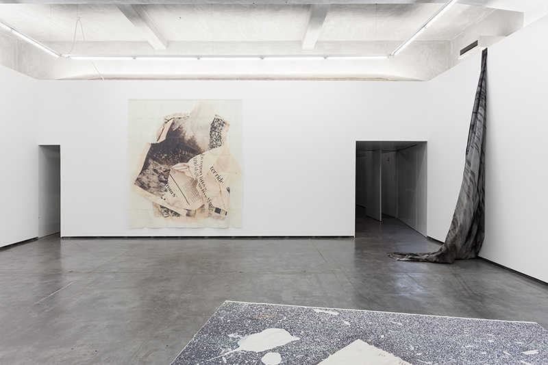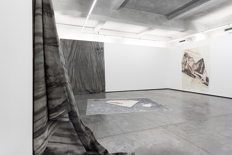 As two languages that communicate without ever perfectly translating, her work associates plastic languages in an idiosyncratic way. No support or material has just one function. Nothing is exactly what it seems. The best example of this free association is the pictorial process applied on fabric, paper, and canvas (with layers of plaster, paint, texturing, etc.). Were it a stage, all these things could be simple décor, expressionist scenarios conferring tonality to whatever happens in front of them. However, in the gallery they assume a prominent and dialectic function as they engage with the text and with the space around them. 1