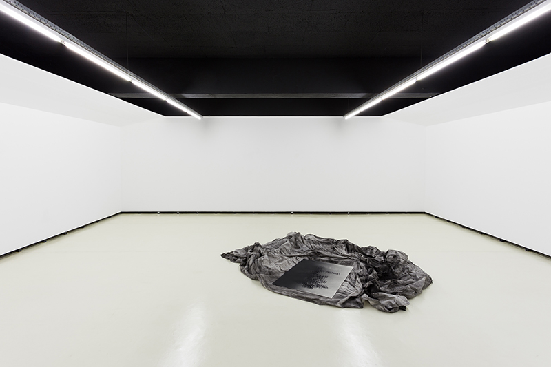 The strangeness of these associations can also be explained by the fact that each gesture is subjected to a process of transformation. “In my work, I have no interest on painting in itself”, admits Catarina Dias, even if she allows herself some pictorial-conceptual gestures, like turning the dripping upside down, or using a paint roller to paint a thick white line, creating different screens on the same surface. We truly need a creative lexicon to describe Catarina Dias’ work. I would like to insist on the ultra-contemporary notion of screen, which can also evoke, however, the diagrams by Alberti or Dürer, where the canvas or the paper are the receivers – through the mental process that calculates the proportions and the line that manifests it – not only of the articulation of a creative process but also of the spectator’s projections, which place the work. Following this line of thought, the floor pieces (painted and compressed fabrics) are at rest. If, on the one hand, they lack the blocking 2 of other pieces, on the other hand, they possess a contained energy. The agglutination of foreign bodies, languages, and the sensual images conveyed by the materials and the poems offer the spectator an awareness of “being here”, and reflect a substantial, singular, and continuous mutation of the act of thinking.