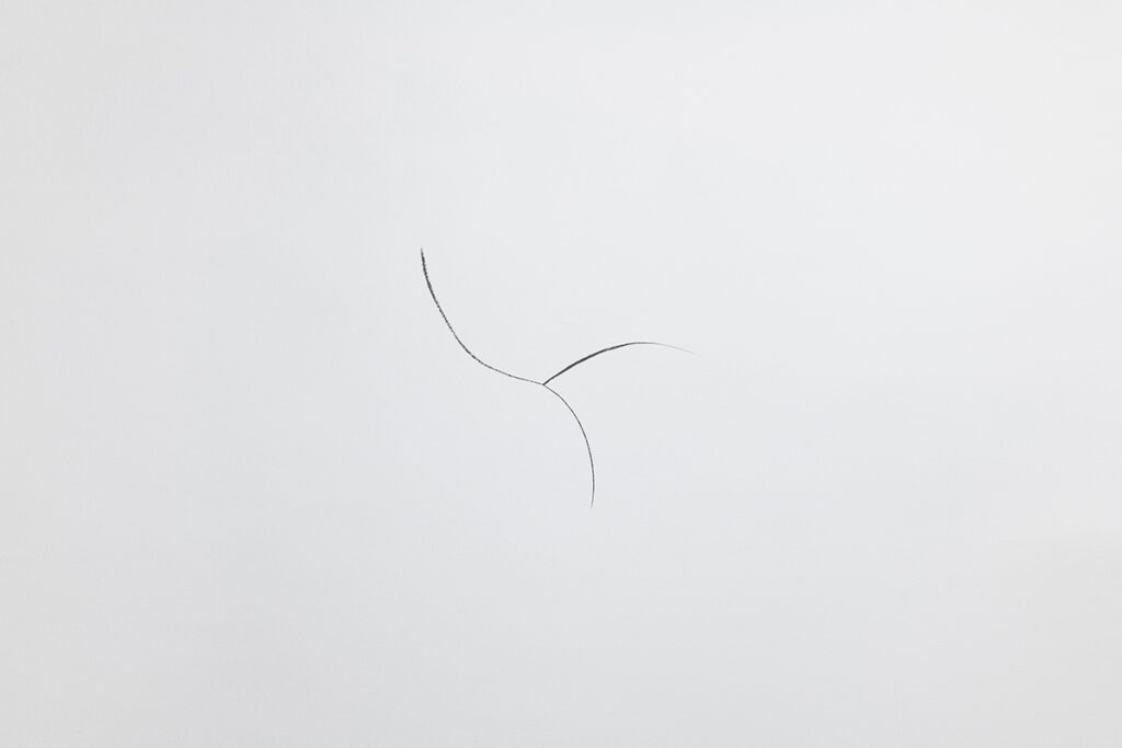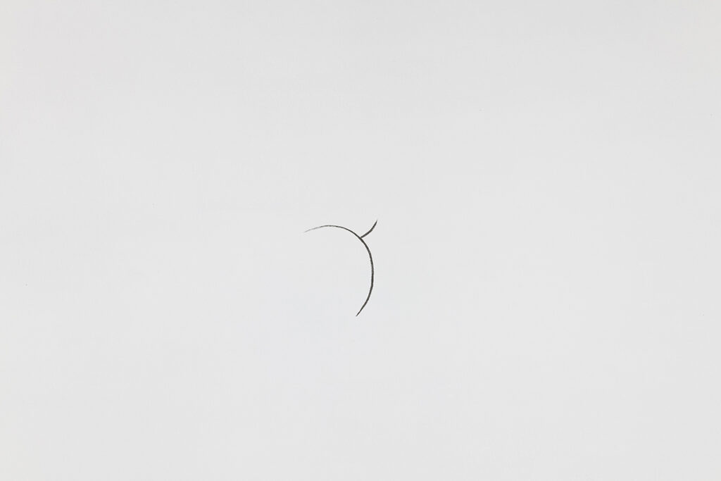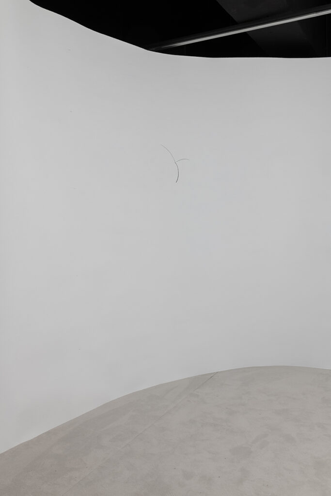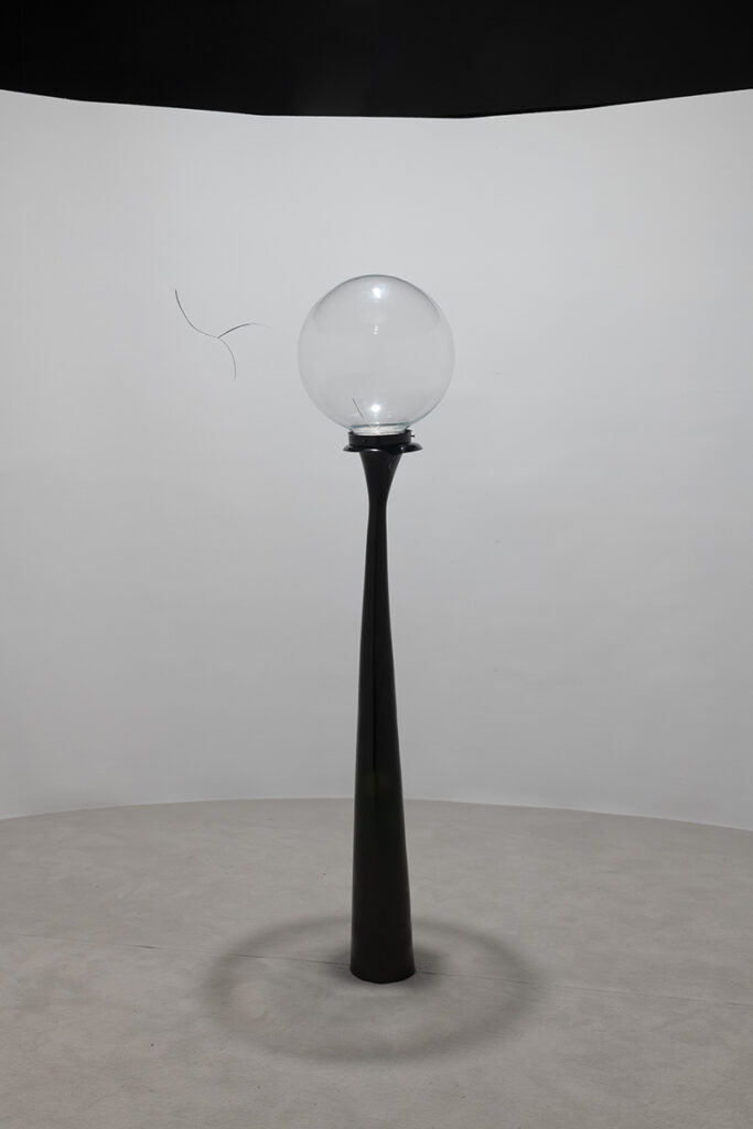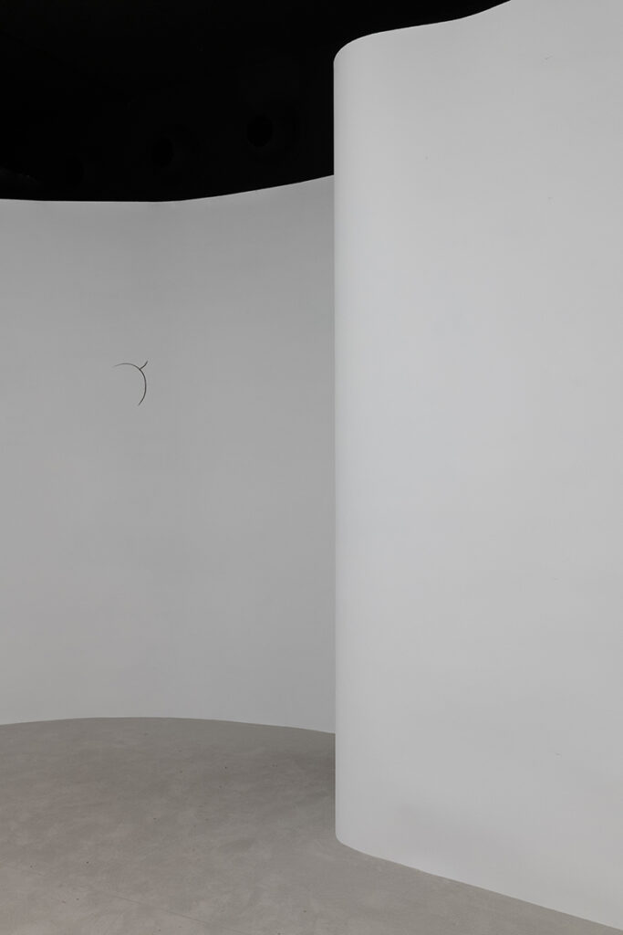 An open and illuminated head at the center, fragilely supported from the outside. An empty and transparent space, marked by pointers that rise in curves and trace somewhere three invisible spheres, or three horizons, or three times: past, present, future.