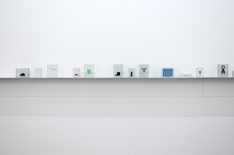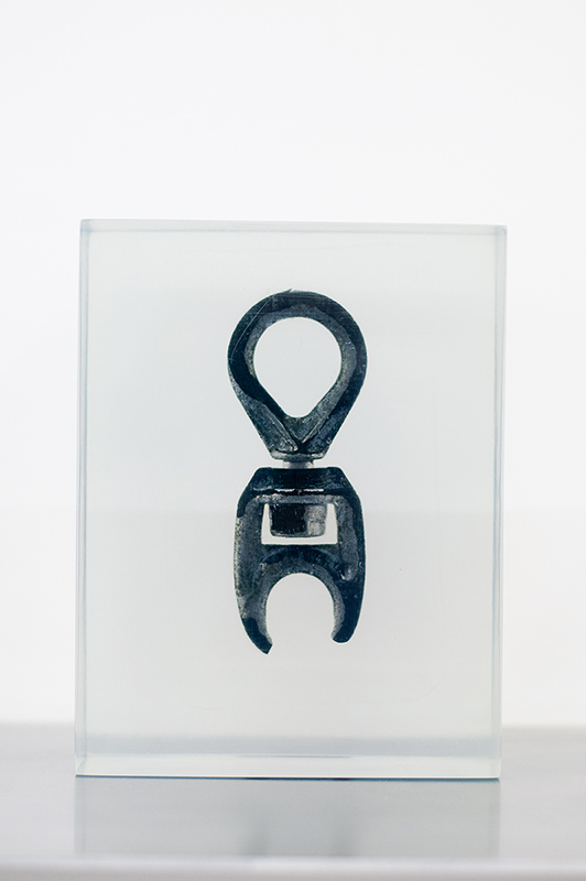 This act of liberation is immediately cancelled out by the action that follows, the enclosure of the objects in acrylic blocks (hygienic cages or translucent showcases) – opaque transparencies. It is in this opacity that these elements reveal everything that they are hiding, a temporal out-of-field, a different moment, earlier or later: that which the object was, is and could come to be. This ambiguous movement of liberation and imprisonment nullifies the play of simple referentiality.