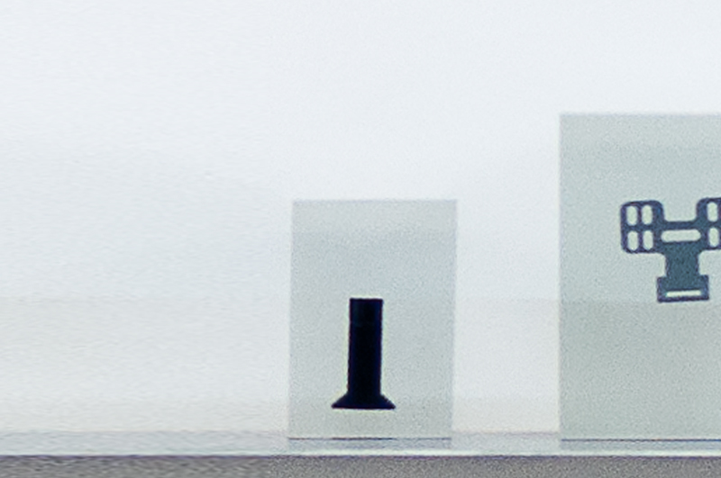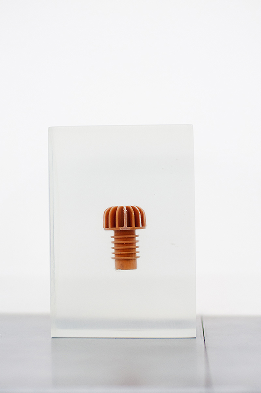 However, more than the ex-position of each particle it is the exhibition of the object that matters. There is nothing innocent about the fact that the capsular device chosen by the designer should exert an amplifying force on each element, behaving like a sort of magnifying glass that highlights and isolates it in the (recently acquired) uniqueness of its identity. These dilated particles, arranged and exhibited on a horizontal plane, are presented as total objects, subjected to some kind of alchemy of freezing, holistic formations in their plastic ontology which must not be interpreted/observed in the light of a dissociative logic of contents-wrapping. The acrylic block resists the status of container: the relationship that is established between the inside and outside is symbiotic rather than proxemic.