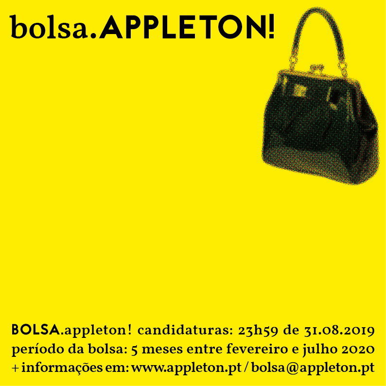 The Bolsa Appleton, worth 9,000 euros, is intended for Portuguese artists living in Portugal, at least 25 years old, for residence in a foreign city for five months. In the first edition, in 2019, the chosen city was Brussels and the grant was awarded to the artist Augusto Alves da Silva. This edition had to be postponed because of the pandemic and the winning artist not having the opportunity to go in 2022 gave it up in favor of Ramiro Guerreiro one of the other 5 finalists chosen by the jury.