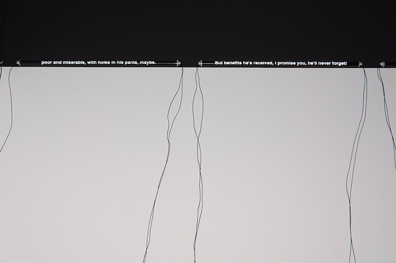 A exposição é construída a partir de um dialogo entre o aristocrata siciliano e o seu criado, o primeiro disposto a mudar para sobreviver e o segundo pronto a desaparecer na voragem do tempo para se manter. De facto, o dialogo que é reproduzido à volta da sala, ligado electricamente ao chão é o espelho de um conflito que nunca se expressa senão dentro da ordem da dialéctica do senhor e do escravo: o primeiro pode negar-se para que a morte da sua condição surja como inútil – e possa, portanto, sobreviver – e o segundo que tem que se manter, tenazmente, inflexivelmente, na sua condição porque é a sua única condição. Um pode renascer das cinzas da sua morte, enquanto que o outro só pode ser aquilo que é: alguém grato ao poder que o criou, desconfiado portanto do poder que o trai por mais que possa ambicionar participar dele.