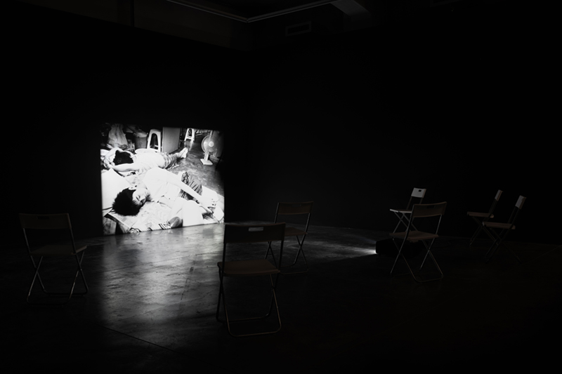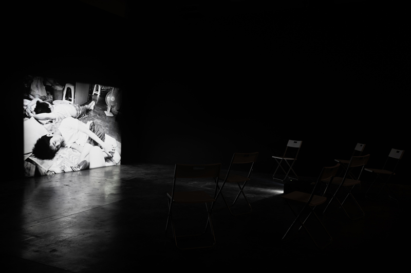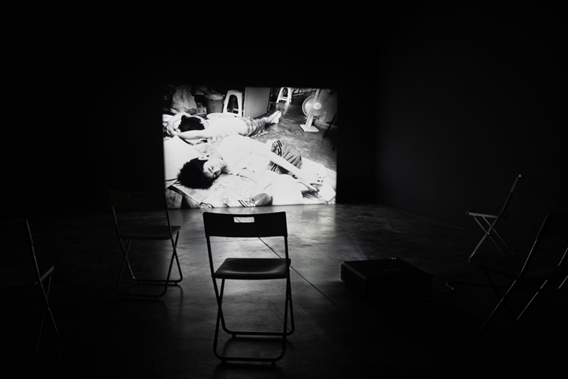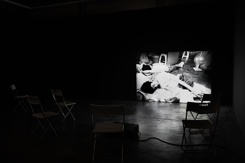 This is the first time that João Penalva has used an objet trouvé for the production of a film. The black and white photograph ‘Cousins – two boys sleeping’ transports us to a domestic setting, though it could also be that of a workplace that also serves as a residence. In the image, we see two young Asian boys in shorts who have fallen asleep on the floor. This is obviously a daytime scene, as there is sunlight in the room. The scene includes a bin, a fan and cheap plastic stools scattered disorderly around the room. One of the boys has an injured foot. From the bottom corner of the image, the leg of a third person in the foreground stands out in the image in an irritating way. It is a photograph that leaves much room for interpretation.