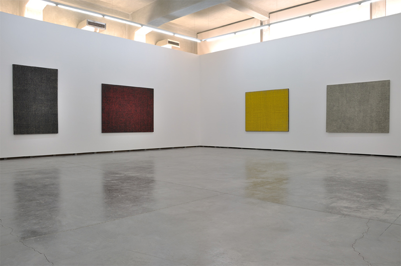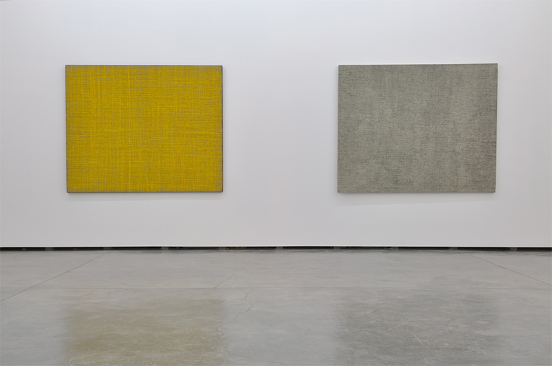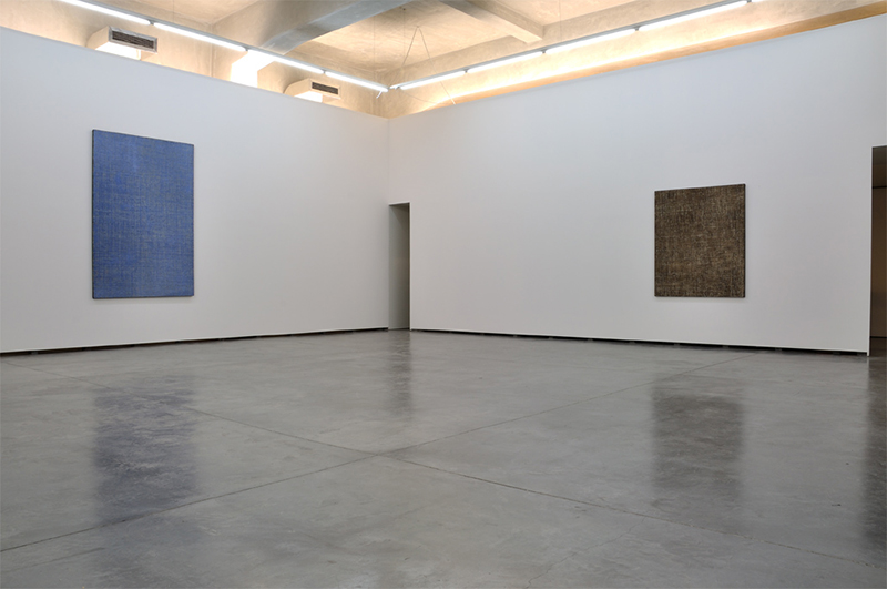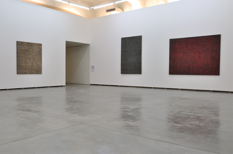 No entanto, a malha tecida em forma de grelha “solta” é enganosa e tende a prender-nos na visualidade aparentemente simples que a paleta económica sugere. É aqui que a tradução pode assumir-se como categoria que permite verter uma prática noutra. Uma é invisível para o espectador, está destinada ao acto do corpo sobre a matéria. A outra, a que é visível, é redentora da primeira e suporta o vocabulário assente na superfície da pintura. JOH não pinta, no sentido mais lato do termo, sobre a superfície da tela. Distende sucessivamente linhas de tinta, procurando o rigor que somente o controlo do seu corpo observa, e persegue uma multiplicidade de aproximações à grelha como tessitura e interstício de uma geometria simples, ortogonal, académica, modernista, abstracta e porventura possuída de uma vontade arquitectónica. Contudo, a grelha sucumbe à acumulação obsessiva que a sua prática exige, postulando em simultâneo a exegese e o excesso, como se a malha espessa convocasse o monocromo e, ao mesmo tempo, a polissemia tonal patente nas pequenas diferenças cromáticas e volumétricas que nos devolvem o movimento do corpo e a sobreposição da matéria como acção repetida e persistente. Mas é com a presença dinâmica do espectador em frente à obra que a leitura se presentifica como momento de reinterpretação.