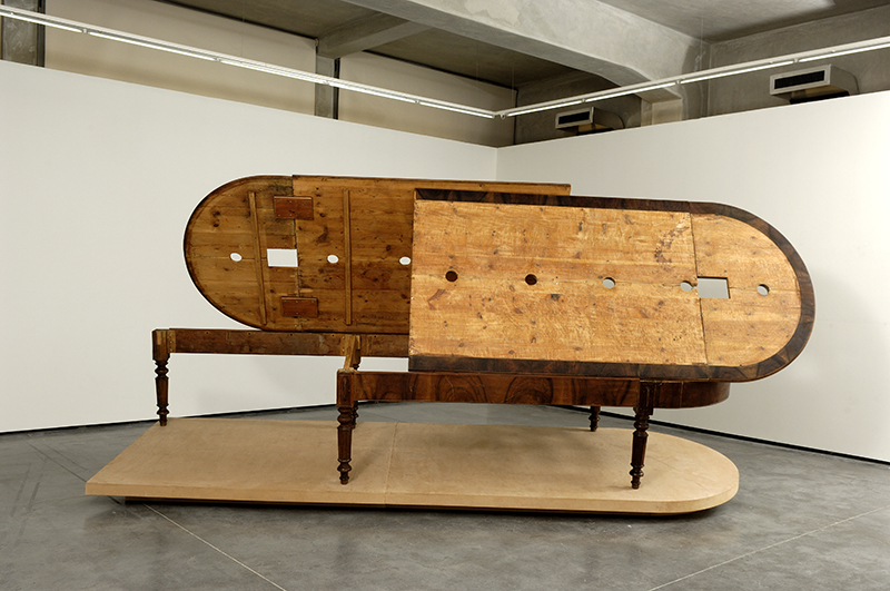 Its base (a reference to the classical plinth) is constructed as a kind of ‘second nature’ on which the whole piece’s tensions and affections rest; its form is drawn from the original item’s (the table), and it adds to it a modification, an almost-double of itself, which generates a vertical torsion and an apparently kinetic motion.