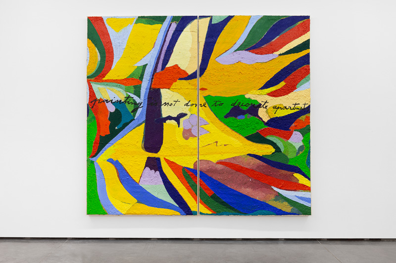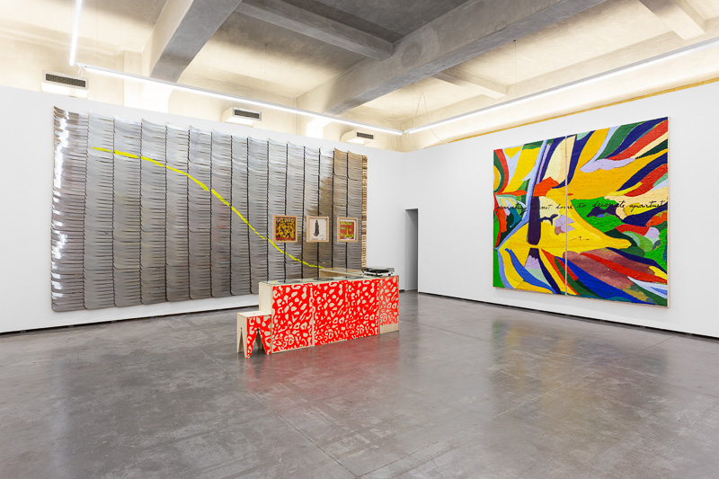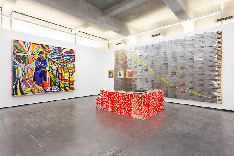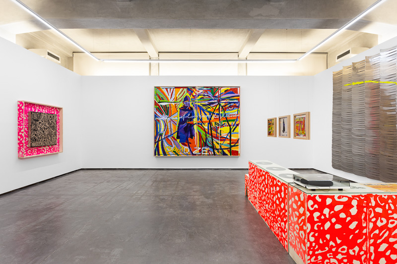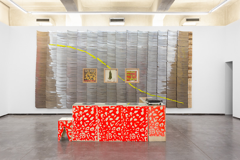 The paintings that pay tribute to these three albums are the result of a dialogue between the essence of vinyl and the visual language of record covers, deliberately created with text and thought. Form is also celebrated here, exploring the square as a common and dominant geometric figure in the various elements that shape the exhibition—from the architecture of the space and the record covers to the frames of the canvases and machetes. Sculpture, here represented by the wooden structure, invokes boîtes-en-valise as a motto to exhibit the vinyls activated by the record players on either side of them, in dialogue with the three suspended frames that exhibit their respective covers. These painting-sculptures constitute visual manifestos that shape music and memory, through these lines, forms, and colours.