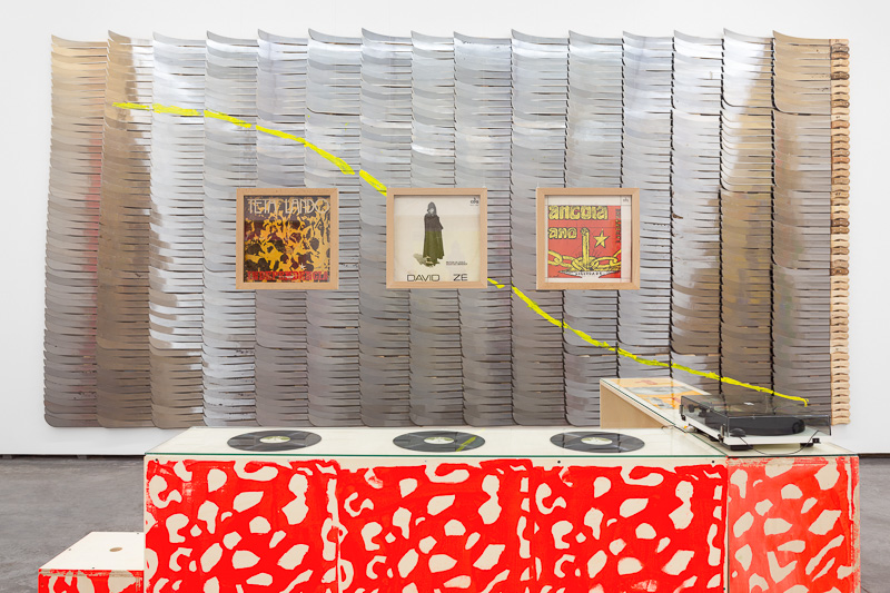 Music, activated through these vinyls, as a sound expression of empowerment of the cause of national liberation and the achievement of independence, establishes a metaphorical and symbolic dialogue with the machetes, which, as a technical support of these paintings, are, in essence, tools of agricultural labour, but also instruments of struggle of the African liberation movements.