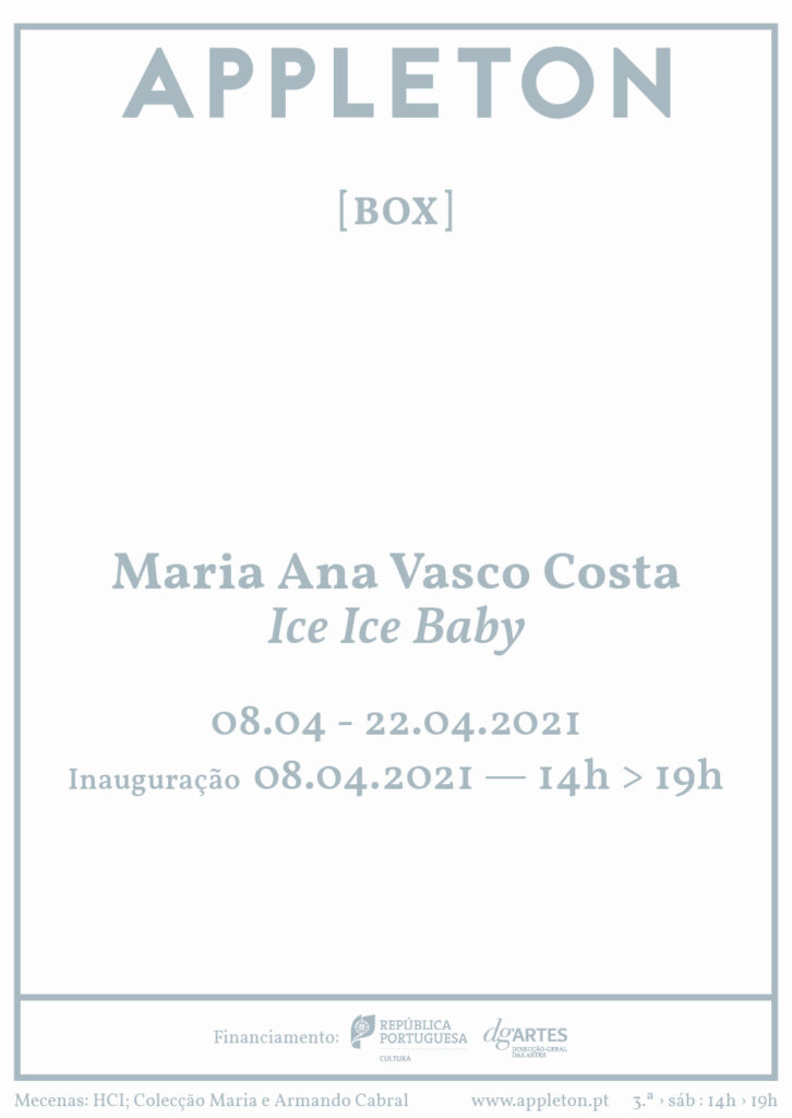 But let me start again. I opened this letter with Robert Frost’s poem because I stumbled upon you when I got better acquainted with the artwork of Maria Ana Vasco Costa, whose exhibition is opening now at Appleton and is called “Ice Ice Baby”, in an ephemeral homage to the hip hop song which marked mine and the artist’s generation. “Ice Ice Baby” because when we enter the room, we feel the cold and emptiness, transported to Antarctica and its glaciers; we find a landscape and an environment that may or may not be similar to that prophesised ending of white and icy light.