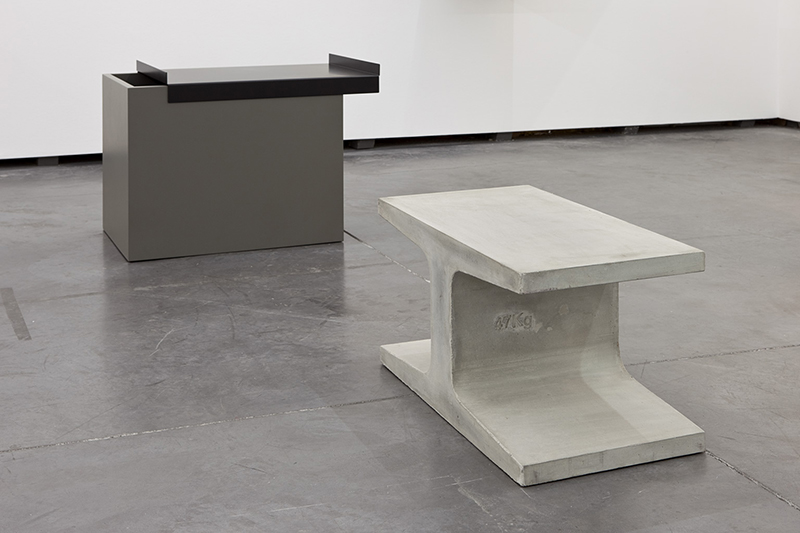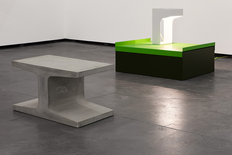Quis Miguel Vieira Baptista também explorar nos objectos que apresenta a materialidade de uma forma pura. Como a mesa feita em cimento em forma de ‘i’, que se assemelha a uma viga cortada e que tem inscrito o peso em relevo – 47kg. A inclusão do peso torna mais presente o material em que é construída.