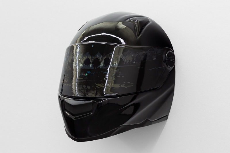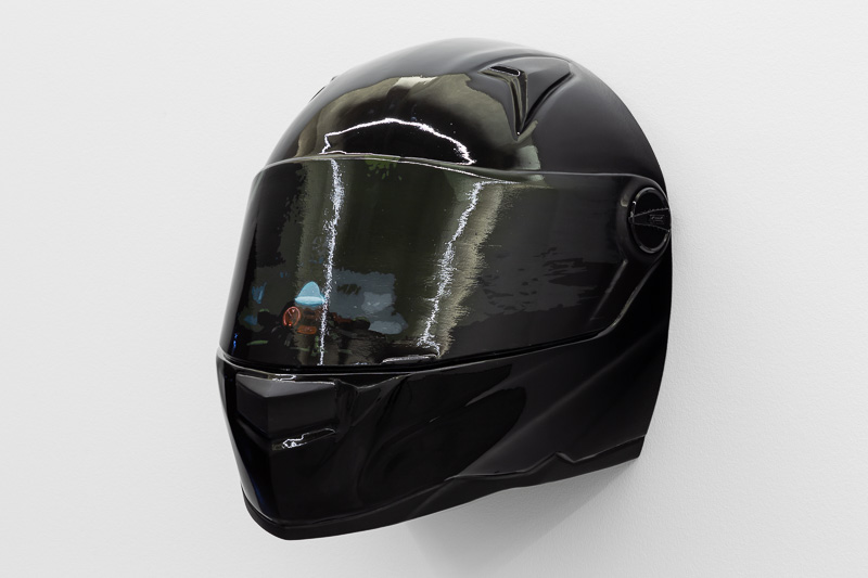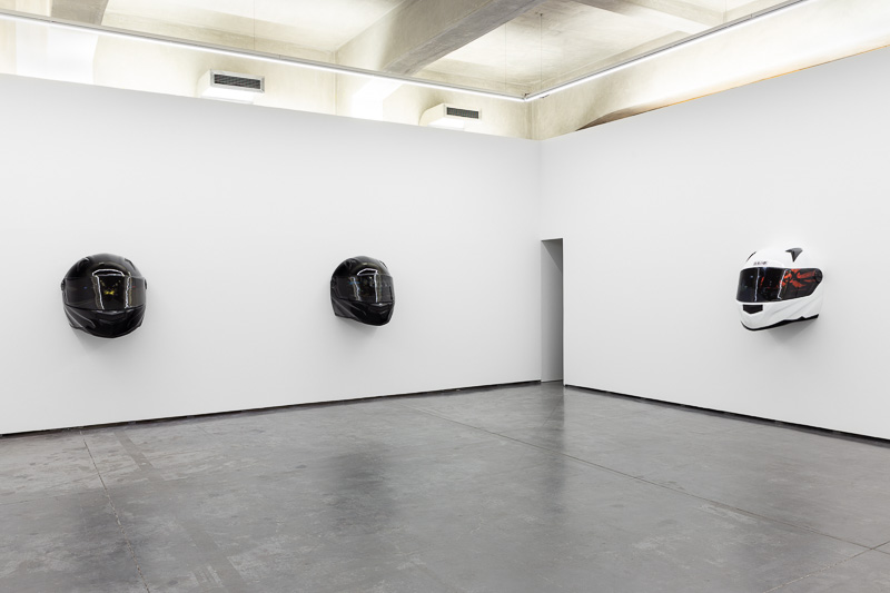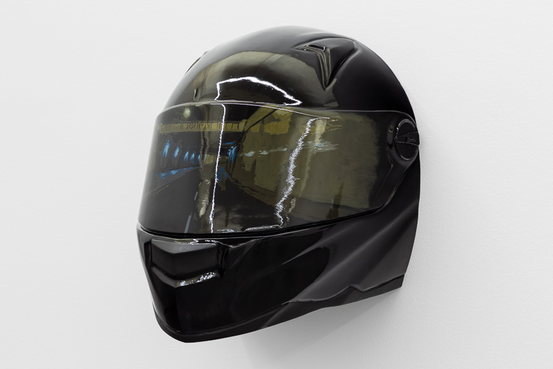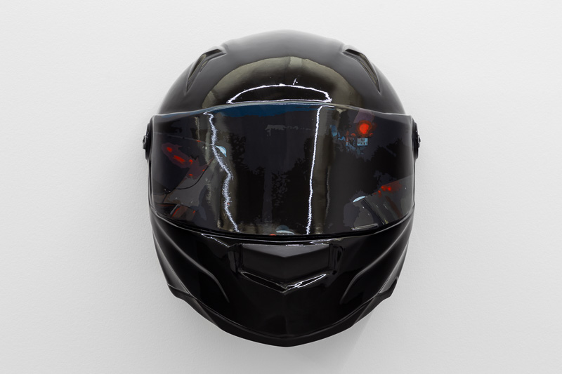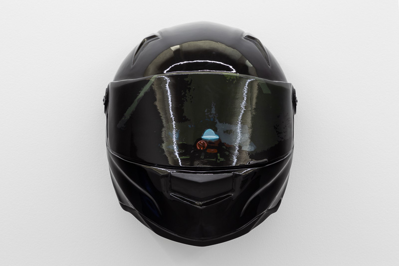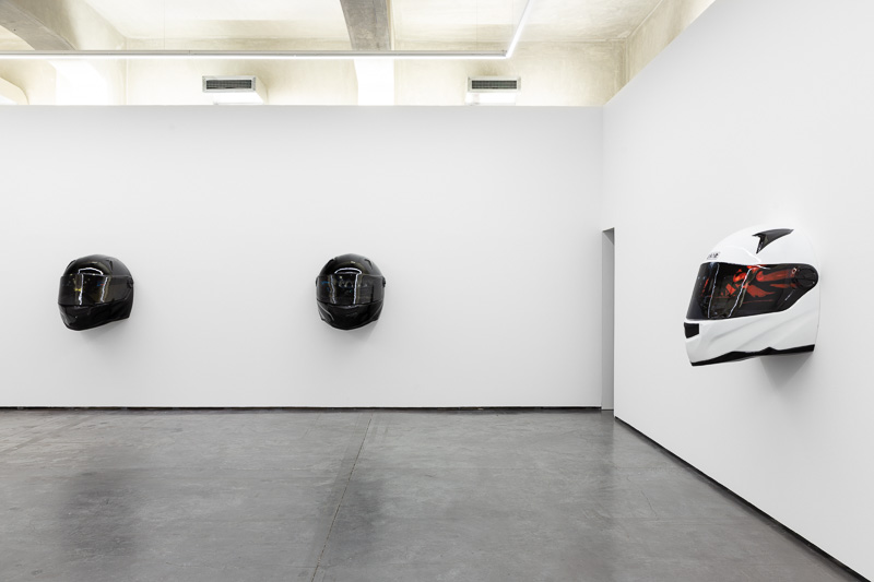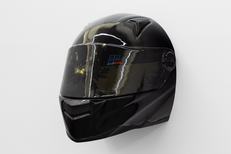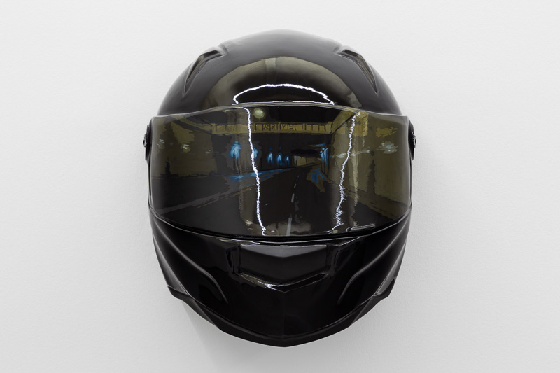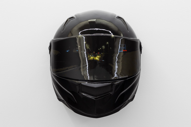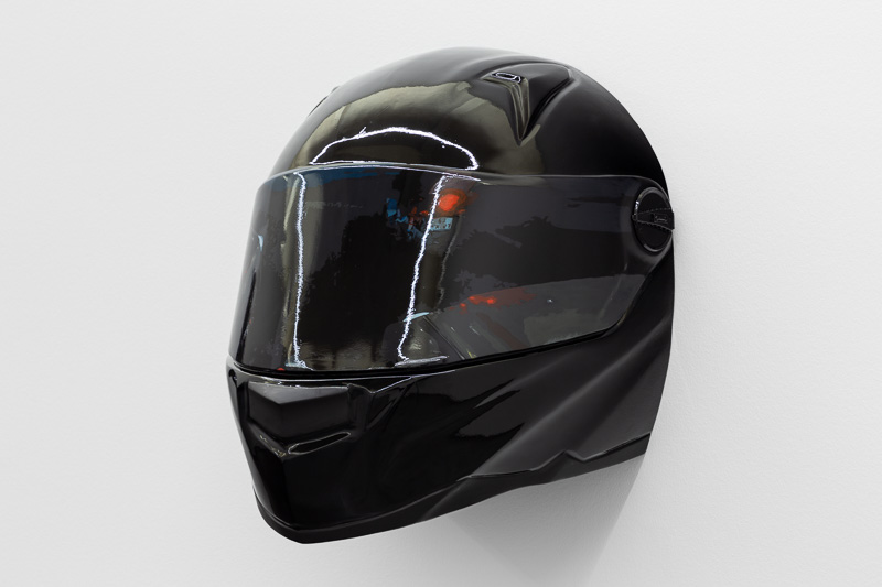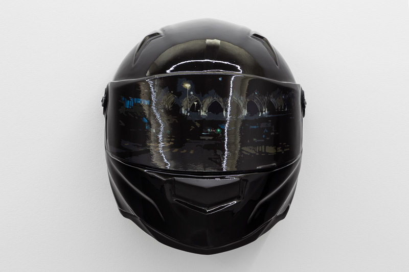 Six oversized motorcycle helmets are spread throughout the space. Each one has a painting on its front screen, the images depicted in the paintings come from video stills. The film, from which they are taken, Tiago Alexandre, explains was shot by himself sitting on a motorbike, speeding across town, from his home to the Lisboa Casino and back. Alexandre continues – ‘on the way there the ride is filled with life, adrenaline, frenzy, hopes and certainties. The way back is also at high speed, but desperation is the core feeling, together with shame and despair, the speed is now suicidal.’