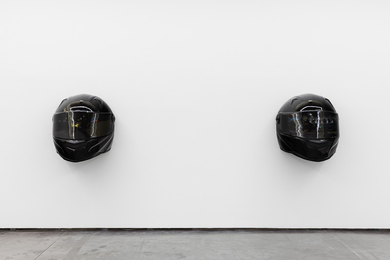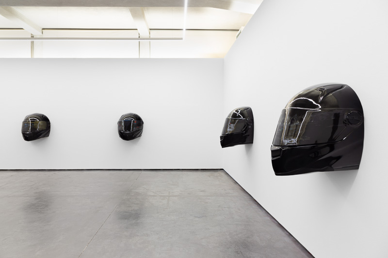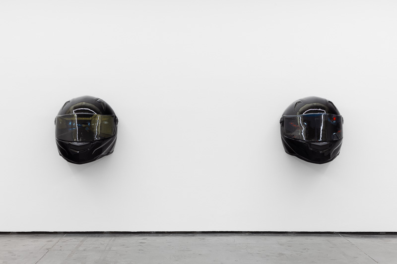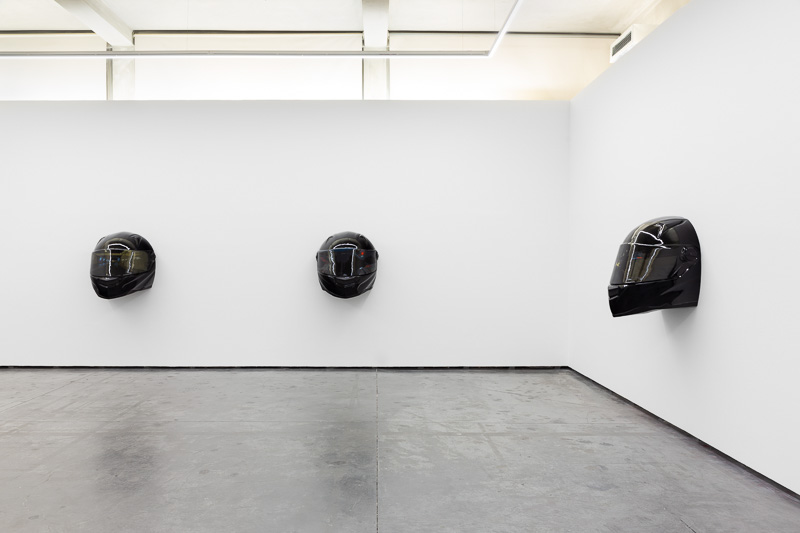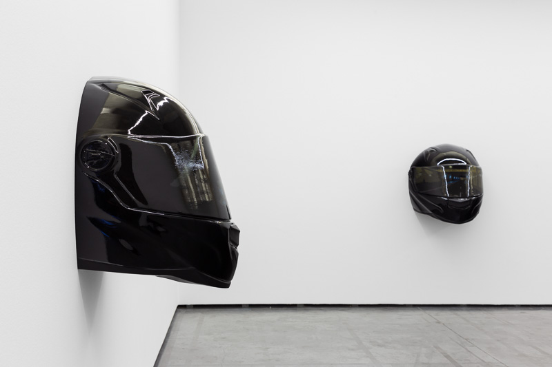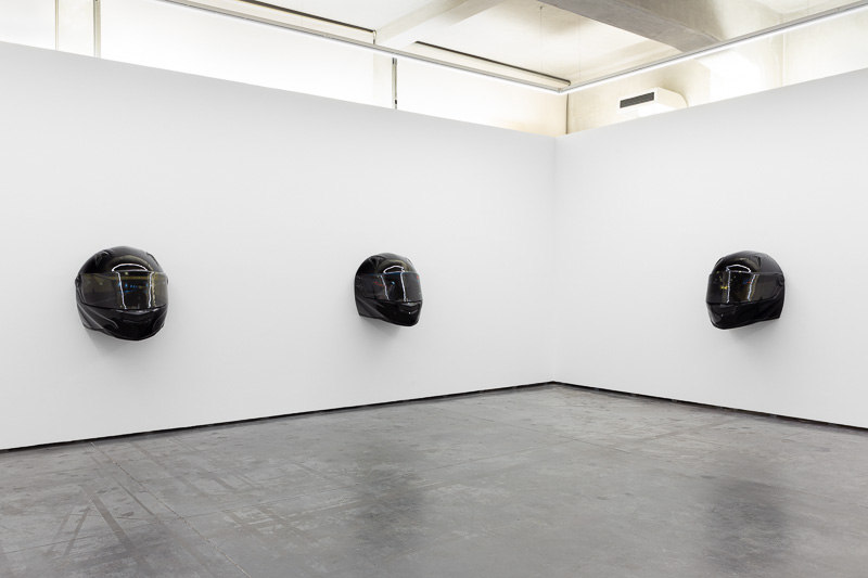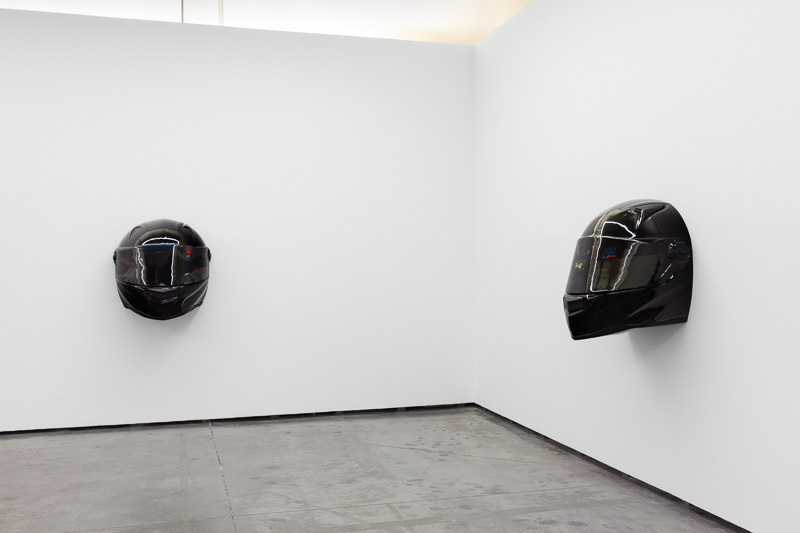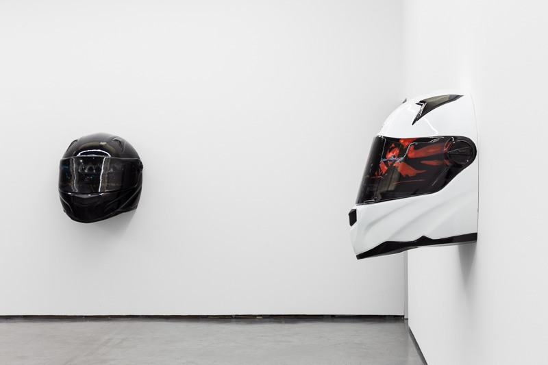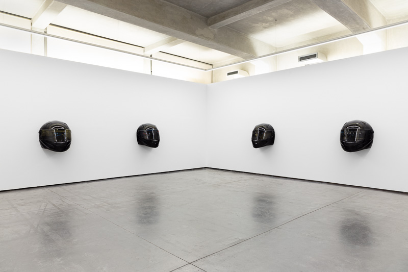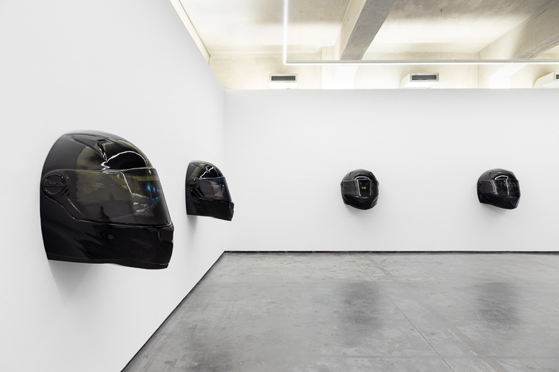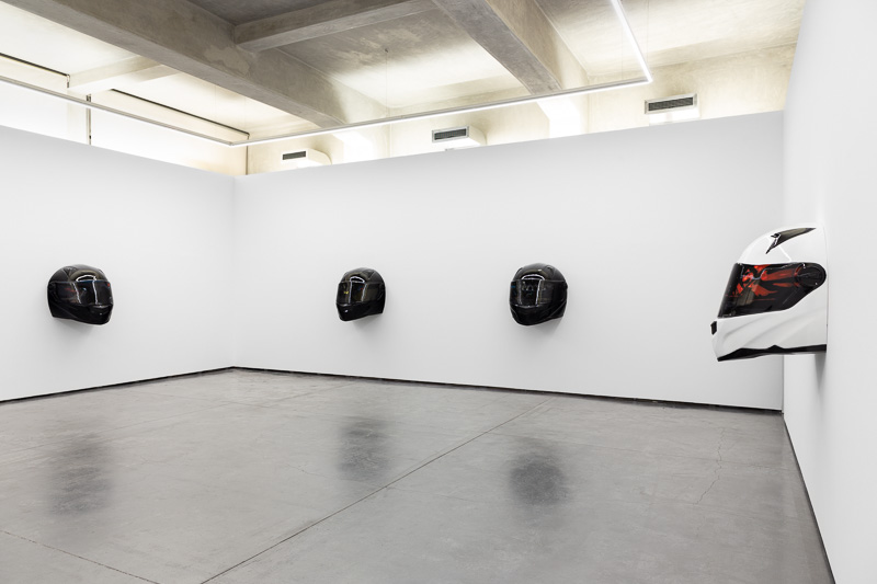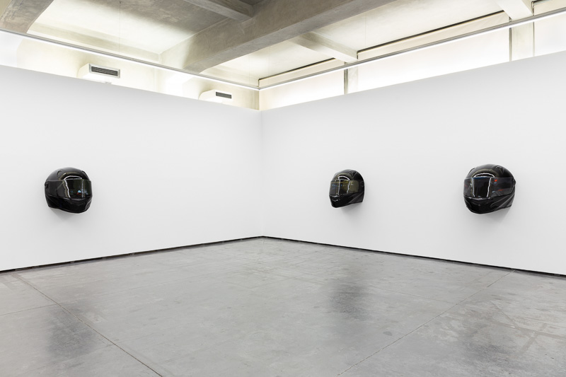 Six oversized motorcycle helmets are spread throughout the space. Each one has a painting on its front screen, the images depicted in the paintings come from video stills. The film, from which they are taken, Tiago Alexandre, explains was shot by himself sitting on a motorbike, speeding across town, from his home to the Lisboa Casino and back. Alexandre continues – ‘on the way there the ride is filled with life, adrenaline, frenzy, hopes and certainties. The way back is also at high speed, but desperation is the core feeling, together with shame and despair, the speed is now suicidal.’