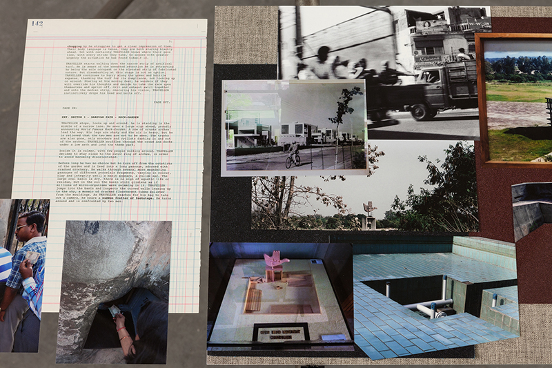 For his first solo show in Portugal, Vonna-Michell will present two installations from the series Capitol Complex (2012-ongoing), a work that started in a small town in Punjab, India, and mainly due to an incident which brought the artist to Chandigarh, and to Le Corbusier´s Capitol Complex. Built soon after India’s independence, these massive buildings embodied the dream of Modern India as well as the new values of democracy. It came to epitomize bureaucracy, the failure of modernist utopia and the post-colonial legacy. Framed by this architectural project: a slide projection, a slanted glass table with a montage of photographic prints and text abstracts and a musical composition attempt to present a concurrently fictional and historical re-reading of modernist architecture and urban planning through the voice of a (retirar o “a” por ser Tris o viajante) Traveller who navigates and explores the city by night until he is ‘entranced’ by the Capitol Complex. While the story unfolds sequentially in the soundtrack, the simultaneous perception of the prints framed within the table and the (retirar e acrescentar antes de “table”) projected images create other streams of associations.