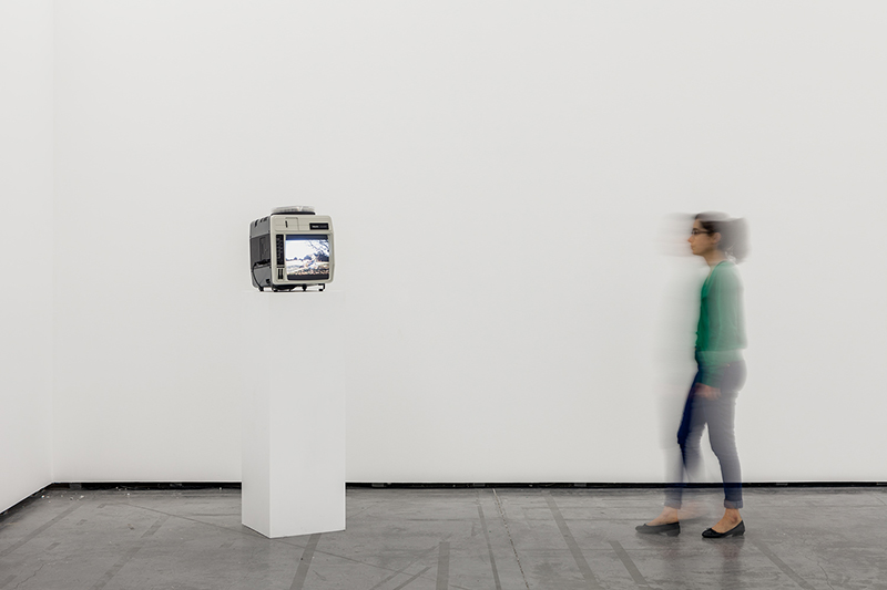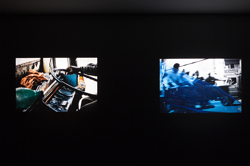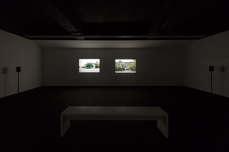 On the lower floor, A Watermark: Capitol Complex (2015) is presented, a dual 35mm slide installation synchronized to an instrumental composition and spoken word soundtrack. Based on a four-act script written by the artist, this installation unravels an abstract sequence of images intertwined with an improvised spoken word and instrumental composition.
