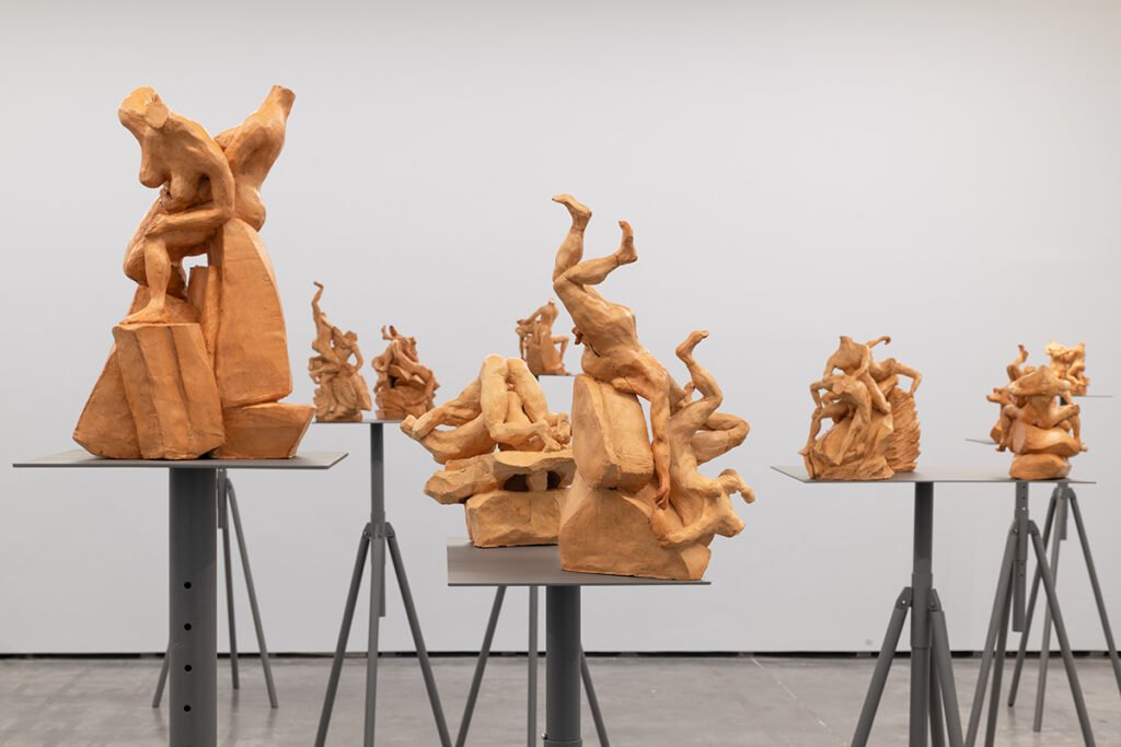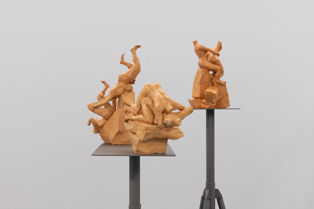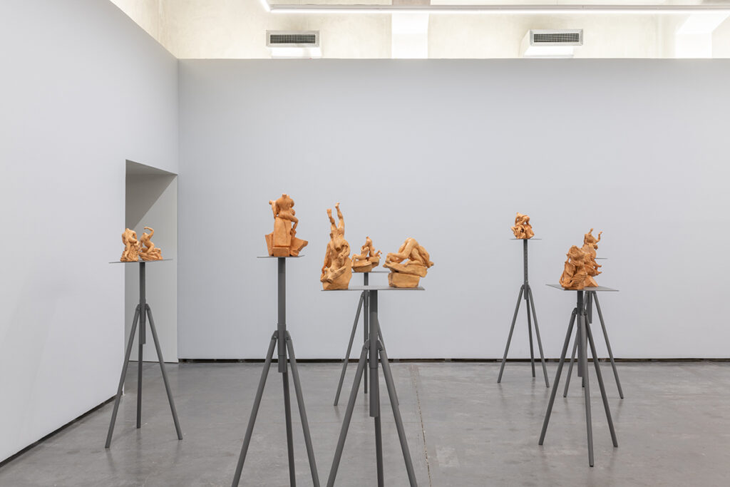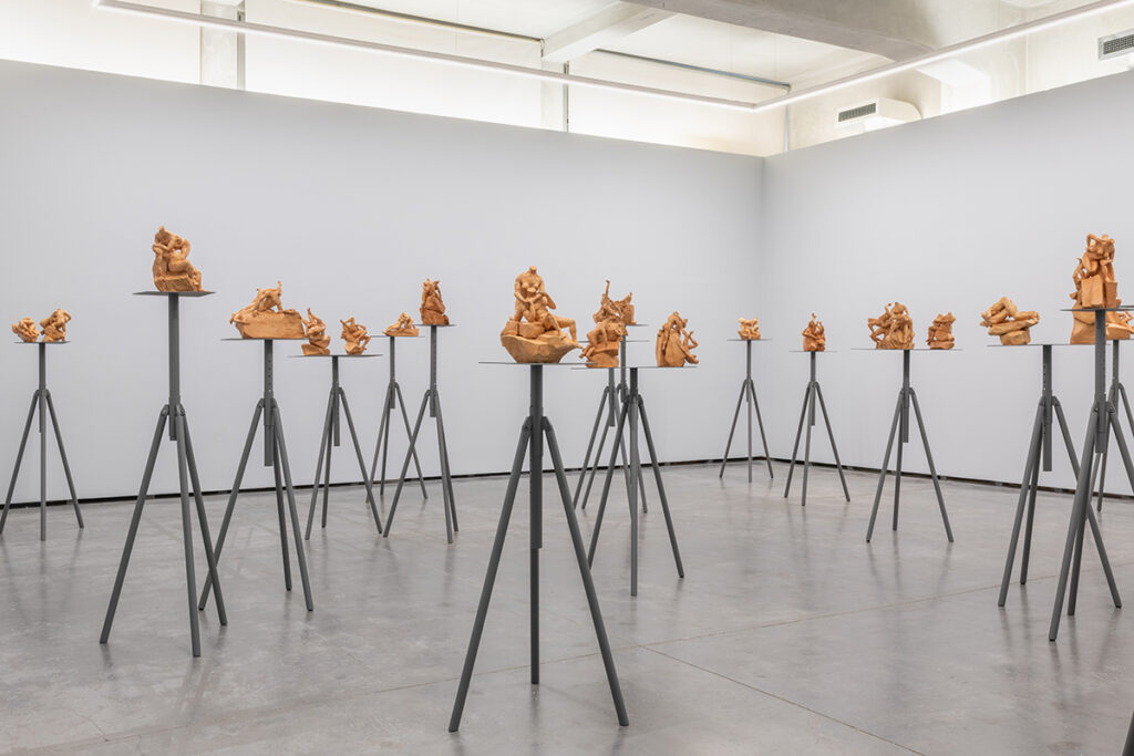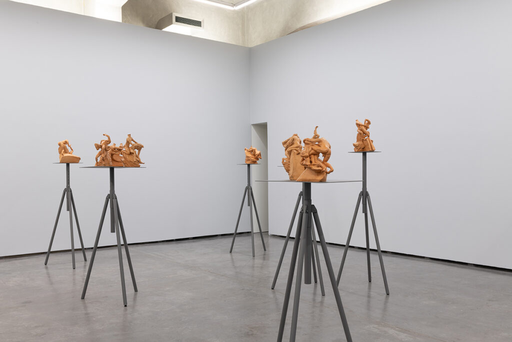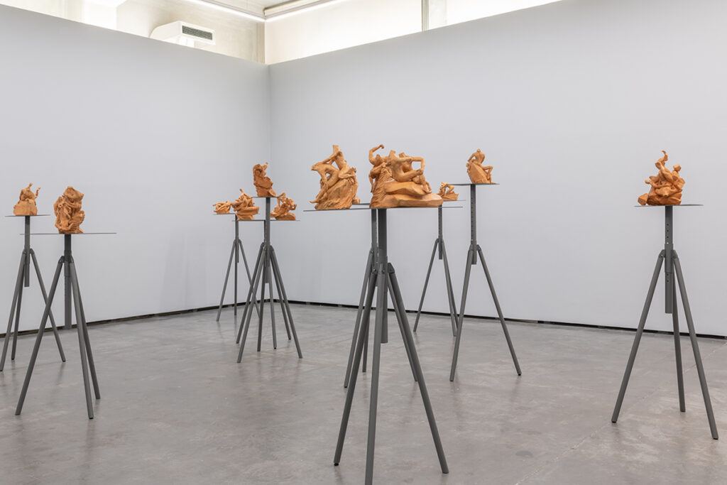 The installation comprises 24 sculptures in red clay (terracotta) placed on 18 metal sculpture tripods. These sculptures draw inspiration from the terracottas of the 17th-century Italian sculptor Gian Lorenzo Bernini, measuring approximately 40x45x45cm each. The figures are studies of various episodes from mythical scenes of Classical Antiquity, including Apollo and Daphne, Mercury and Battus, Hercules, Nessus, and Deianira, among others. Formally, they capture various actions, positions, and movements based seemingly on the seminal catalog of images from classical sculptures but in a way that seeks ambiguity of meaning, doubt, in a contemporary gaze regarding what is presented, oscillating between the ideas of life or death, love or violence, or even sex or abuse.