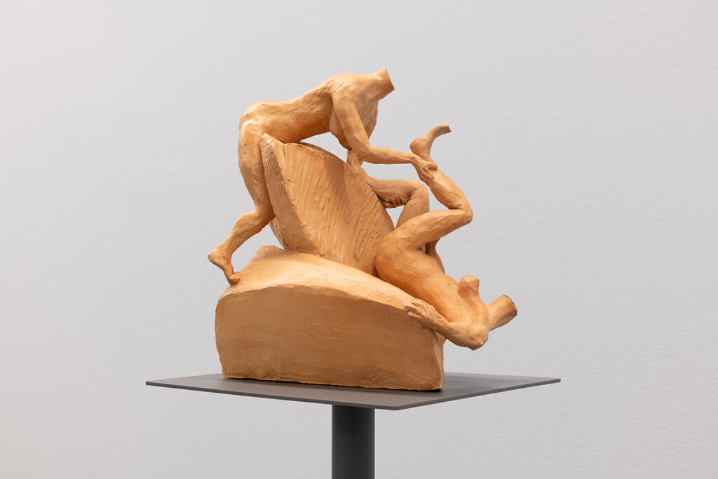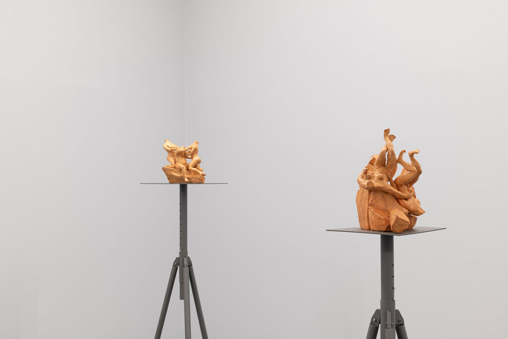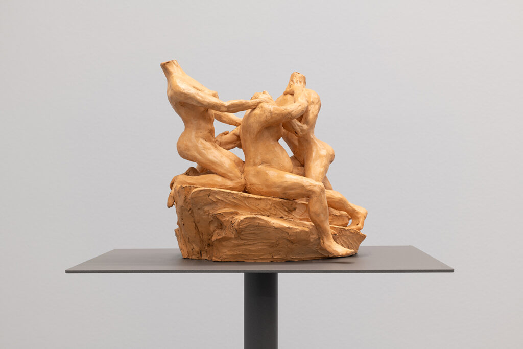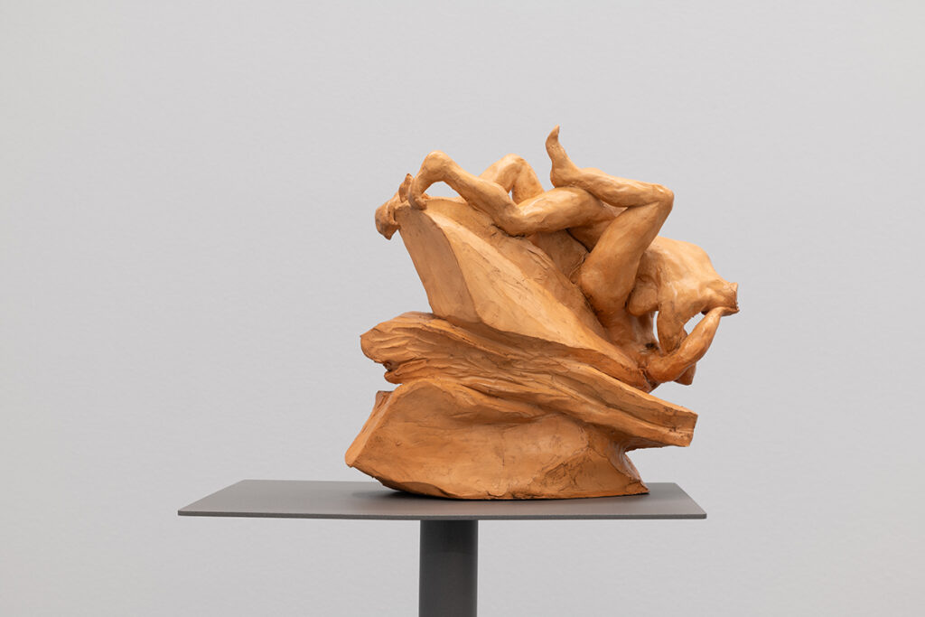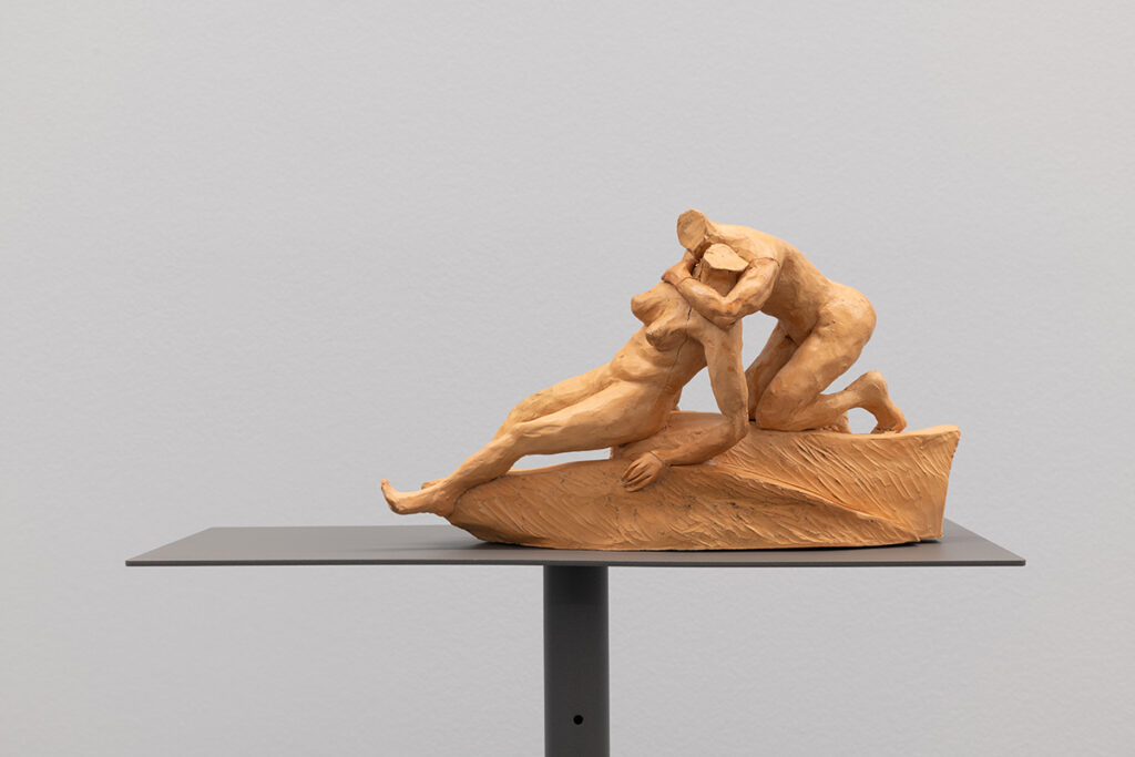 The aesthetic and formal structure of this installation lies in the ambivalence of the figures’ actions, the violence of the presented images, the psychological emotions invoked, and the exaltation of bodies in conflict, questioning the relevance of images and stories from the past in shaping how we live, see, and feel the present. Eros and Thanatos also evoke the ideas of power, fragility, imbalance, or instability present in the confrontation between bodies, gender struggles, serving primarily to make us reflect on this set of themes that shape us and persist to this day.
