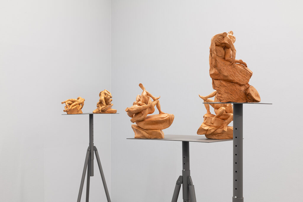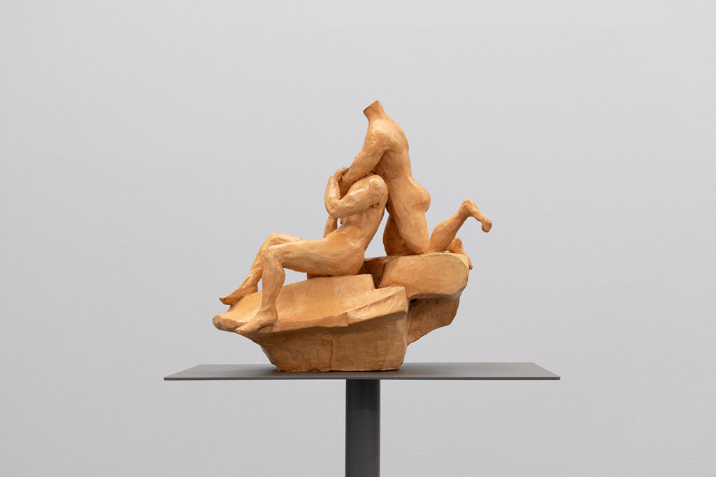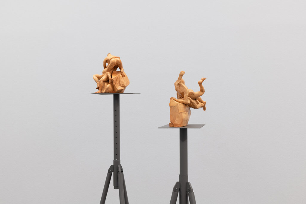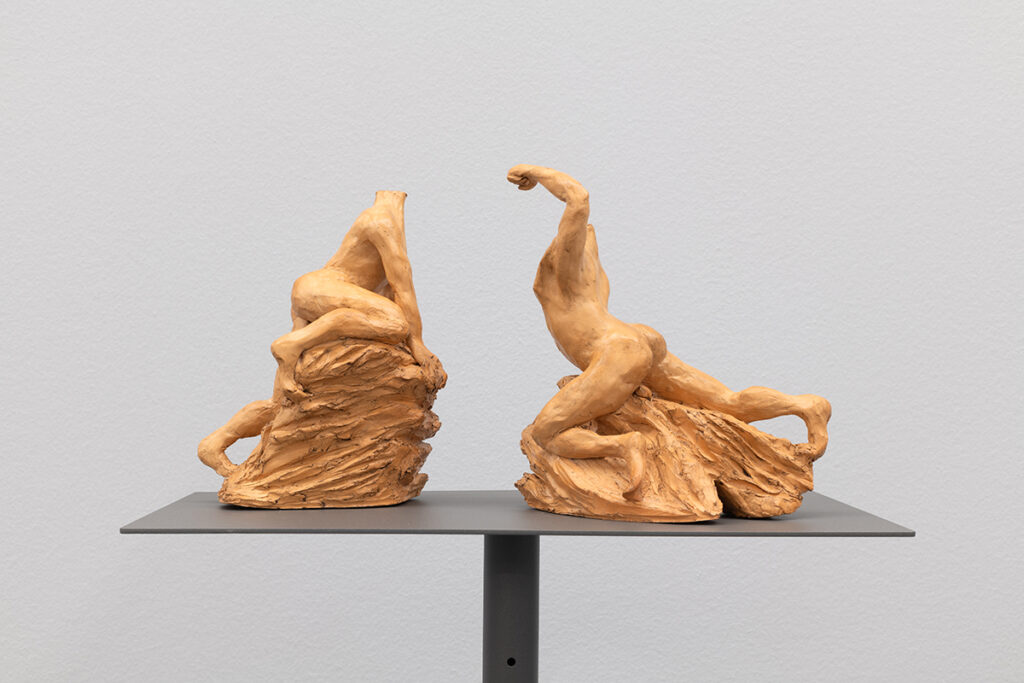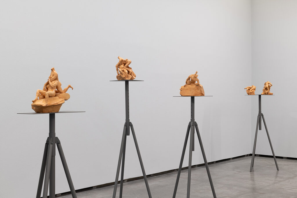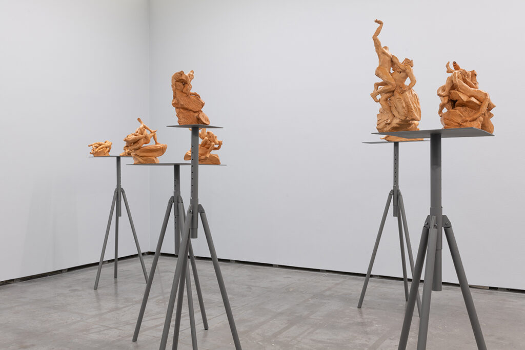The aesthetic and formal structure of this installation lies in the ambivalence of the figures’ actions, the violence of the presented images, the psychological emotions invoked, and the exaltation of bodies in conflict, questioning the relevance of images and stories from the past in shaping how we live, see, and feel the present. Eros and Thanatos also evoke the ideas of power, fragility, imbalance, or instability present in the confrontation between bodies, gender struggles, serving primarily to make us reflect on this set of themes that shape us and persist to this day.