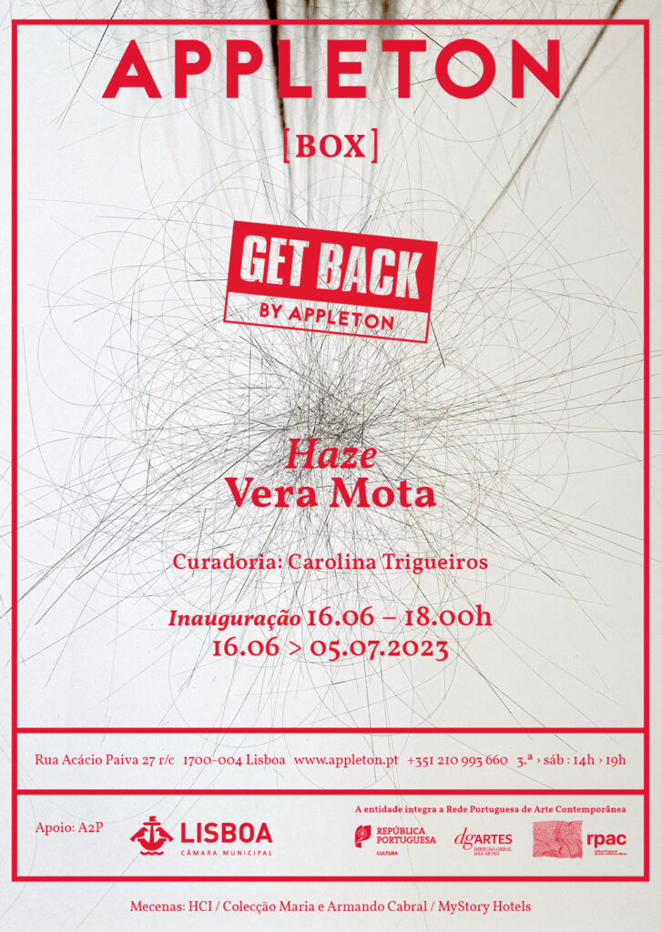 After 10 years, and on the occasion of the 16th anniversary of Appleton, the ‘Get Back’ cycle appears in the convergence of favourable conditions for the return of Vera Mota for a new chapter. With no rigorous chronological pretensions, but attentive to the natural transformations of her practice, it is interesting to think about this re-inhabiting of the same space where nothing can be exactly the same. Matter has its own vibration and the bodies inhabited by it, also subject to the patina of time, remind us that everything is in constant movement, inevitably in the fluidity of impermanence. Returning to or staging that same space is perhaps like an old smell that one can recognise. ‘Haze’ thus achieves that state of a suspended spirit, that possible aroma, touch, sensory recognition, a diffused mist that envelops the works and leaves the exhibition space in a limbo. A contemplative atmosphere is forged by steam as an indefinite condition and the elements as concealment or fantasy.