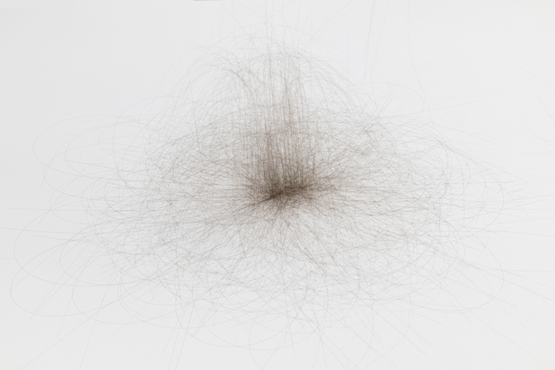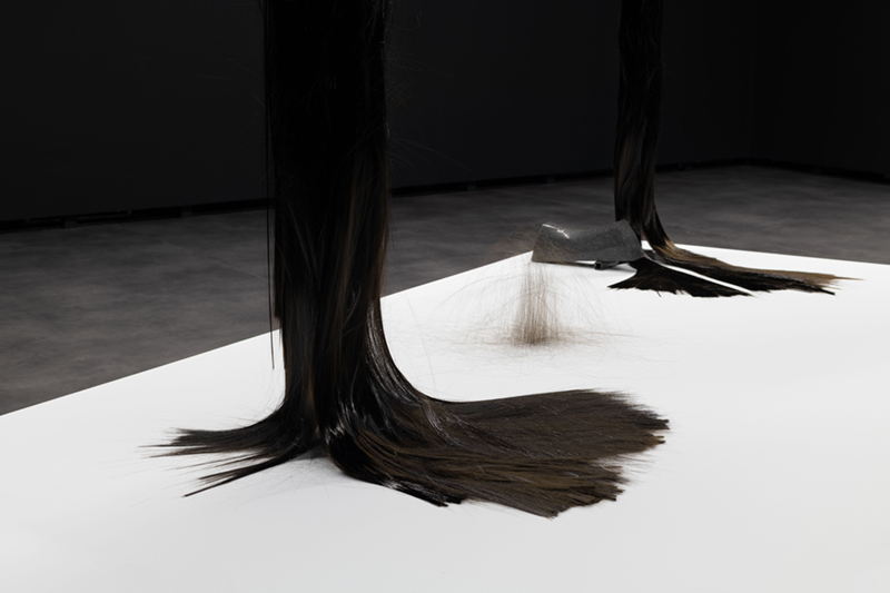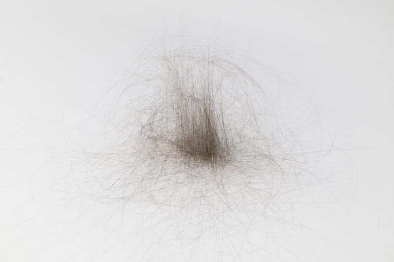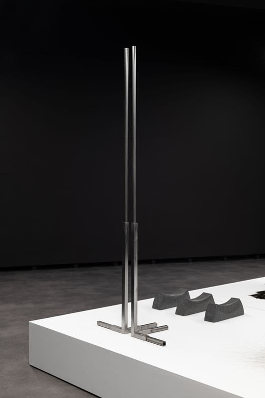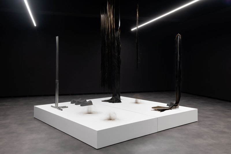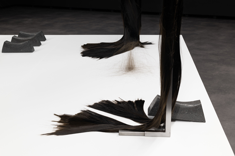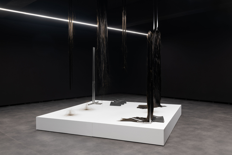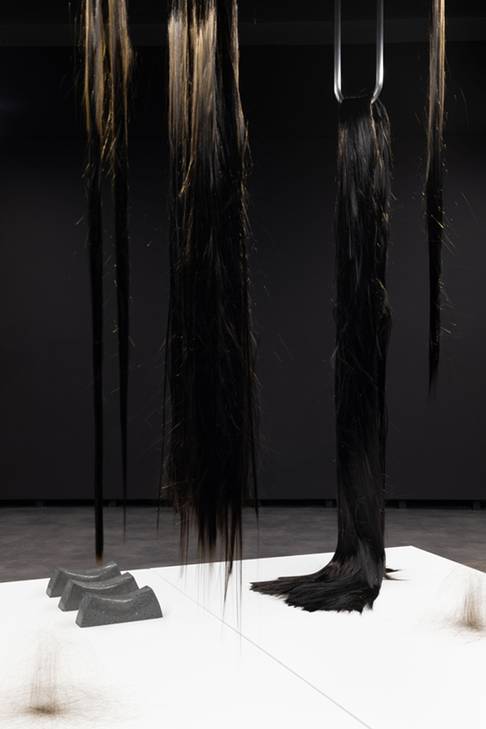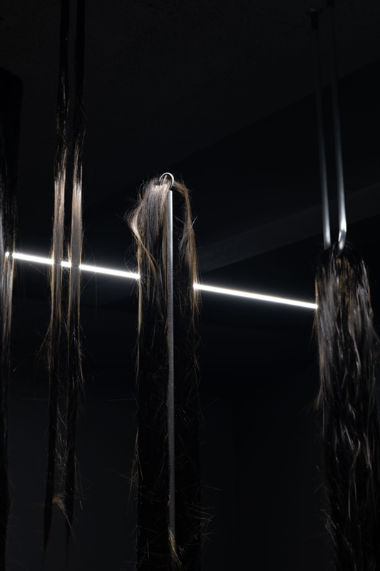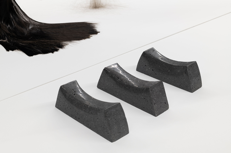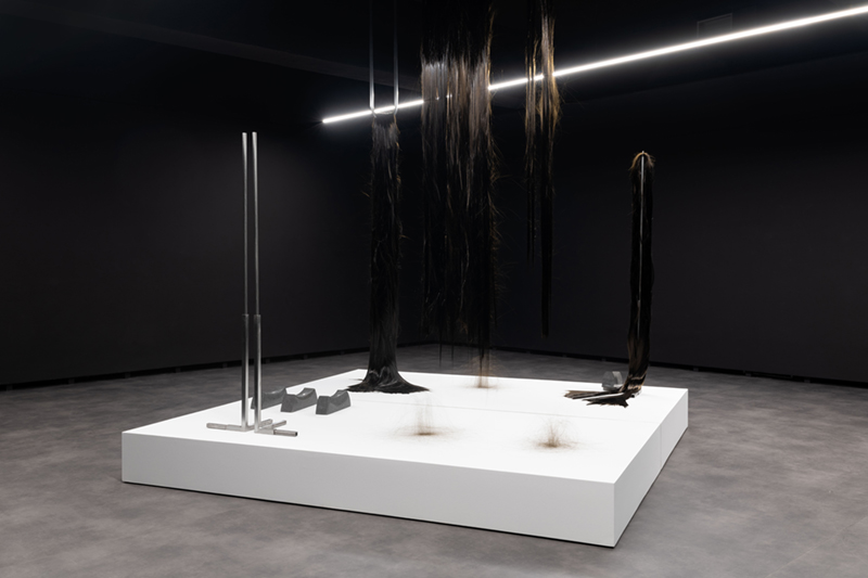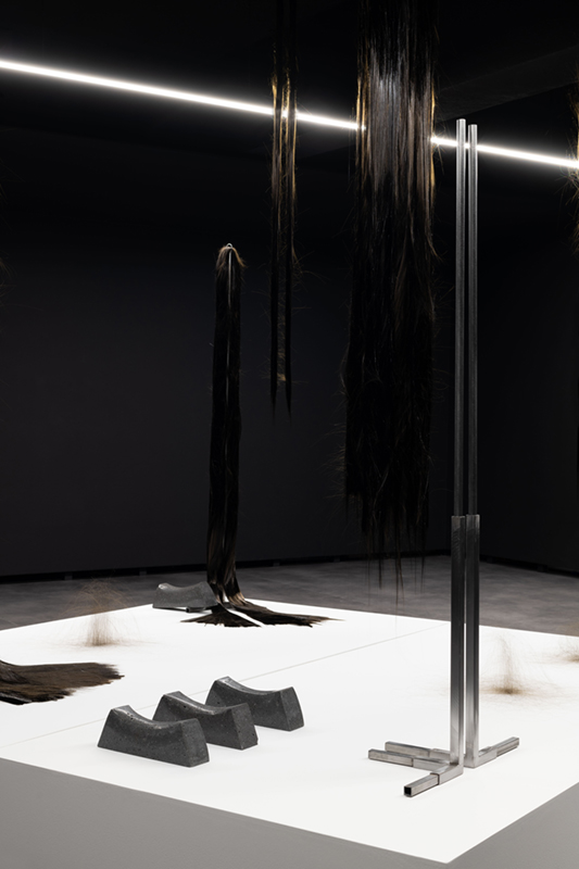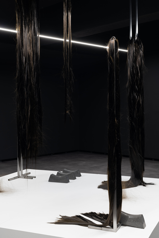 While in ‘Schema’ Vera Mota used elements of mineral origin, like graphite, combined with other materials, such as leather, in ‘Haze’ the focus falls on basalt, a volcanic rock she studied during periods of residency and research in the Azores. The fusion between the intrinsic mineral nature of the rock and its transformation into a malleable form by means of technology creates a tension between the natural and the artificial, between rigidity and fluidity, the natural qualities of the fibre and its capacity to be manipulated by hand. Basalt fibre is made using advanced fabrication processes, including the melting of the rock, which contrast with its existence as a geological body in the oceanic crust. As Coccia* reminds us, all forms of matter have a vital dimension and vitality is not exclusive to living beings, but permeates the entire cosmos. Thus, the filaments that rest in silence as a spatial installation find paths among the light and shadow effects, the absorbent tone of the walls and the white and metallic notes of the supports that broaden sculptural existences. The rough and resistant qualities of basalt fibre, linked to its reduced ecological footprint and resistance to high temperatures, mean that this material is widely used in civil construction and the textile, wind and aerospace industries. A futuristic aspect contrasts with apparently familiar, delicate qualities, like a strand of hair or an animal trace, a scrap of fur. A state of renewal or emancipation, like a reptile shedding its skin and leaving its old body behind. A faint line dissolves between what appears to be and what is, in a world of sculptural animism, where the perspectives of the body and materiality are constantly redefined in a tangle of possibilities between living and inanimate forms.